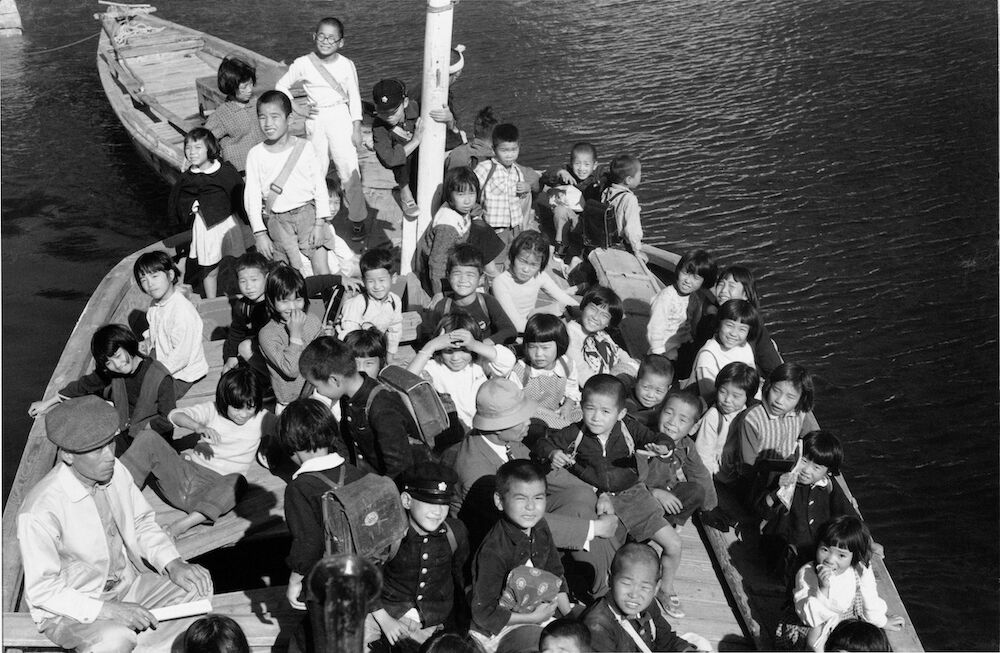 山口県大島郡周防大島町大字浮島楽江。学校から船で帰る小学生。1960年10月26日。