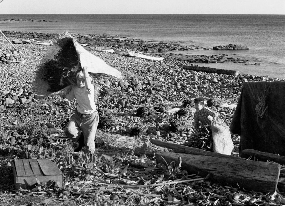 北海道利尻郡利尻町。海岸に干したコンブをとり込む親子。1964年8月3日。