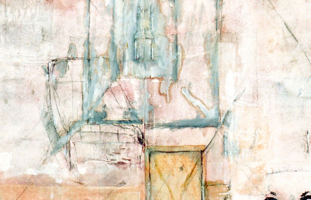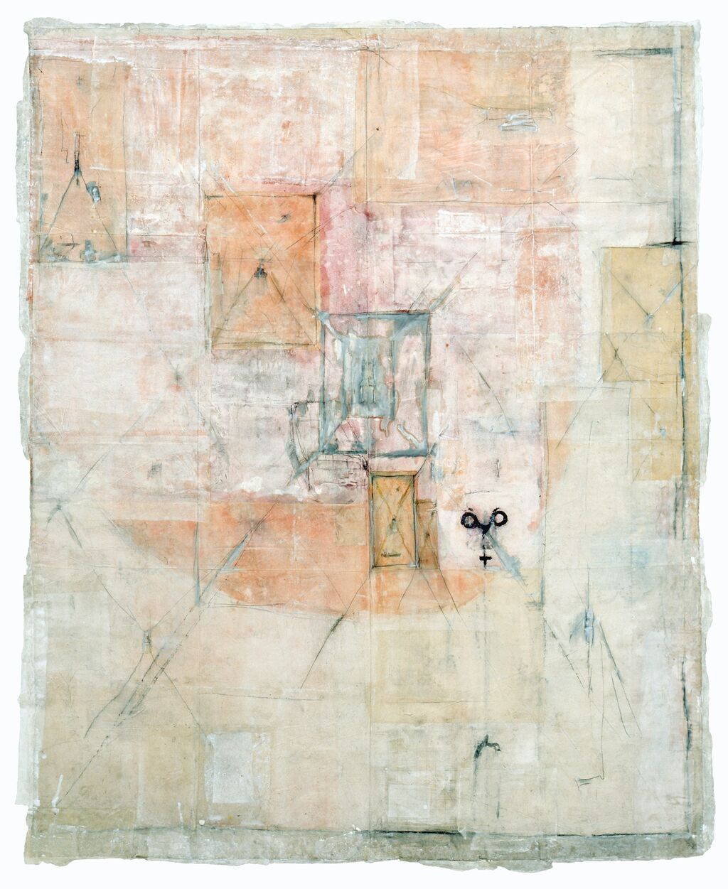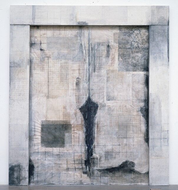 空間層ー椅子のある 1997年 ミクストメディア、和紙コラージュ、胡粉、木炭、コンテ、チョーク、油彩、インク、ポリエステル布 257 x 208 cm (拡兆する美術’97 展 つくば美術館 にて発表)