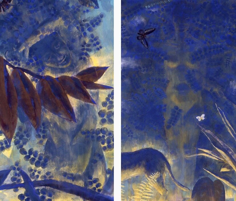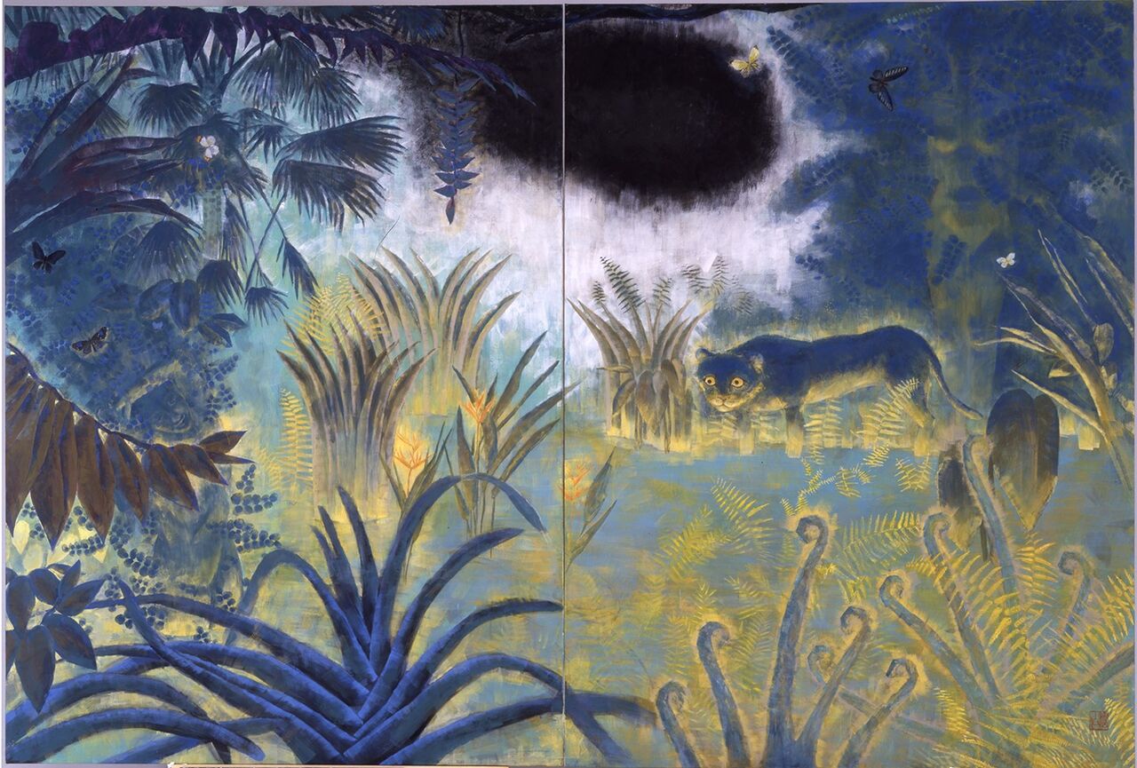 六八判サイズの雲肌麻紙を2枚パネルに張り込んで、岩絵具で描かれています。群青や緑青は(宝石を砕いたようなものですから)天然ものはとても高価です。学生だった私に買えるような代物ではなかったのですが、当時中国人留学生たちのお世話をしていたので、中国の天然岩絵具をかなり安く譲ってもらっていて、青と緑のトーンは贅沢にもそれらを使っています。