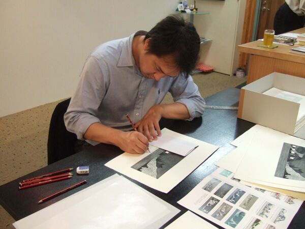 2012年 版画にサインを入れている光嶋裕介さん