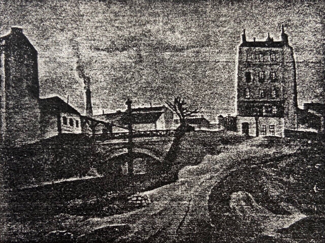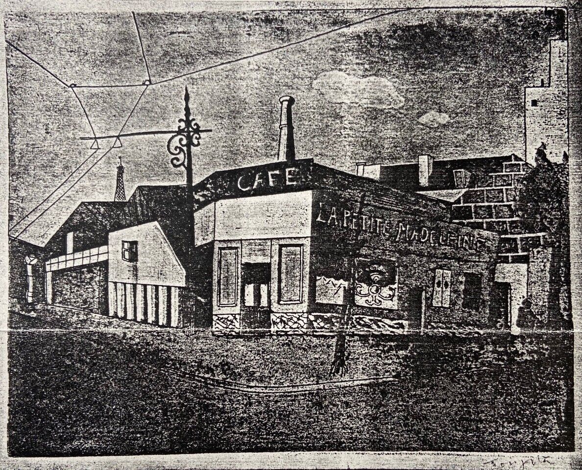 松本竣介が所有していたと思われる1943年発行の藤田嗣治の造形芸術社版の『藤田嗣治画集』の図版にある『ヱルガキネ街』(図2)は大八車、黒いシルエットの人物(ここに描かれているのは子どもで、ハンドル付きのキックボードで遊んでいるようである)のモチーフが松本竣介の風景を思い起こさせる。さらに『モンスリー附近』(図3)の構図は『Y市の橋』に酷似しているように見える。銅版画作品『煙突のある風景』(図4)も『街角(横浜)』(図1)とよく似ていて、松本の作品だと言われても納得してしまいそうである。