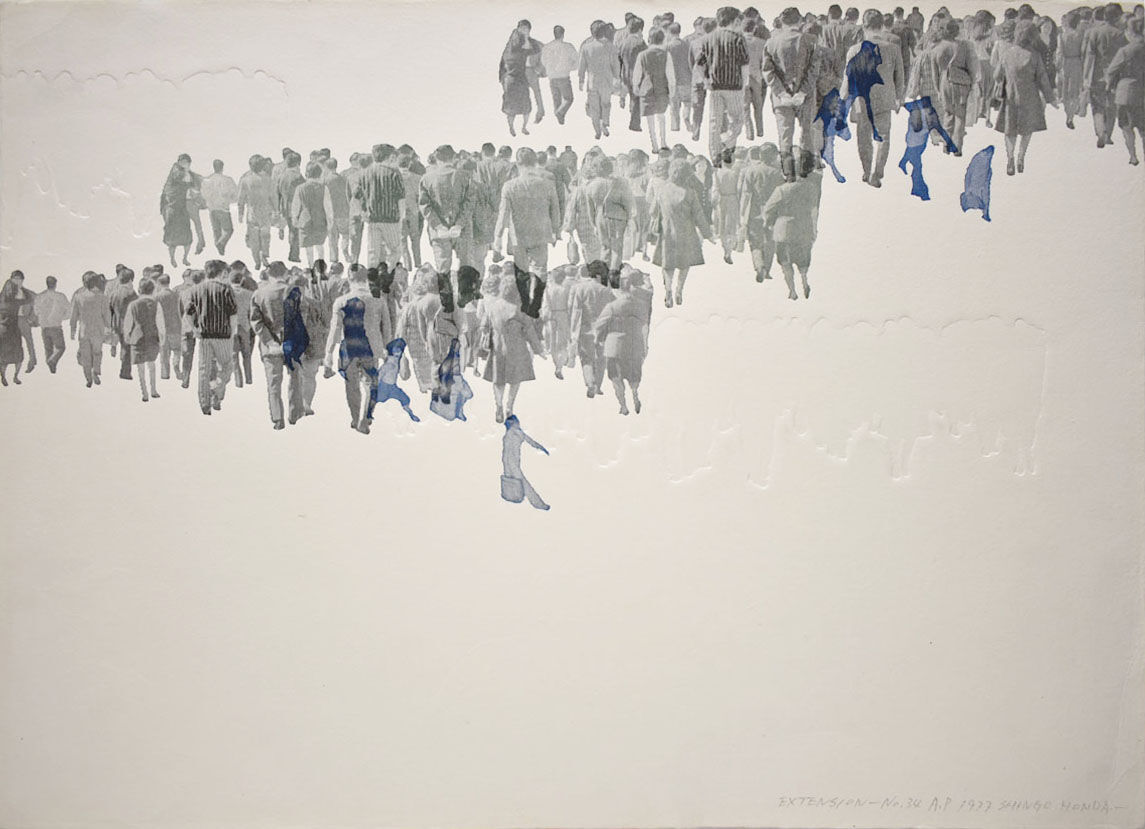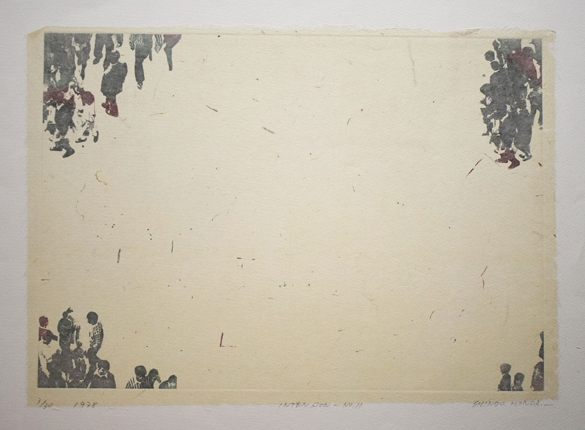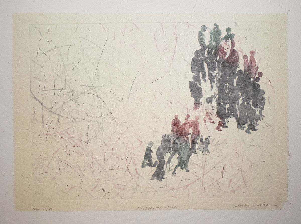 "INTENSION"(意図)シリーズも同じく人々をモチーフにしていますが、雁皮紙の風合いと刷りの加減によって人々がより抽象的な形になっています。