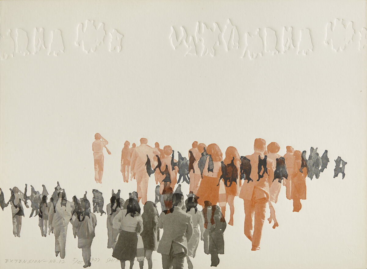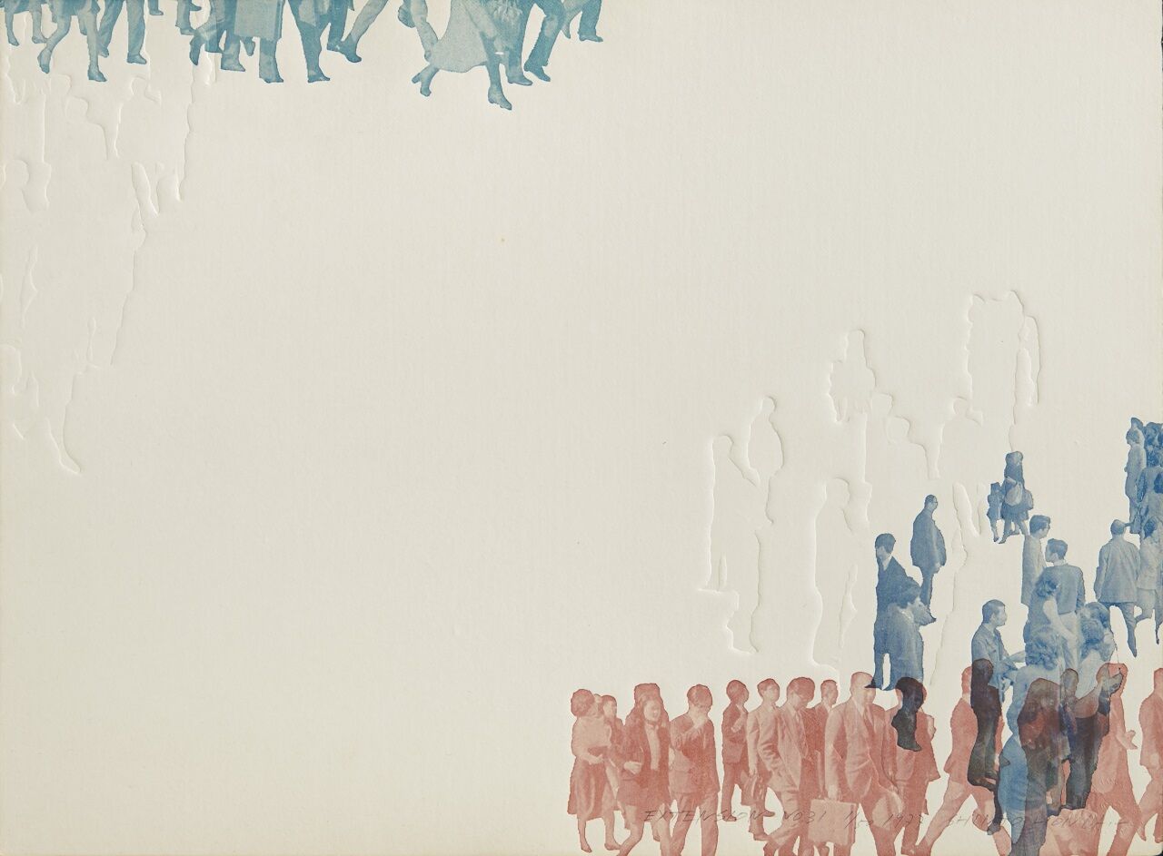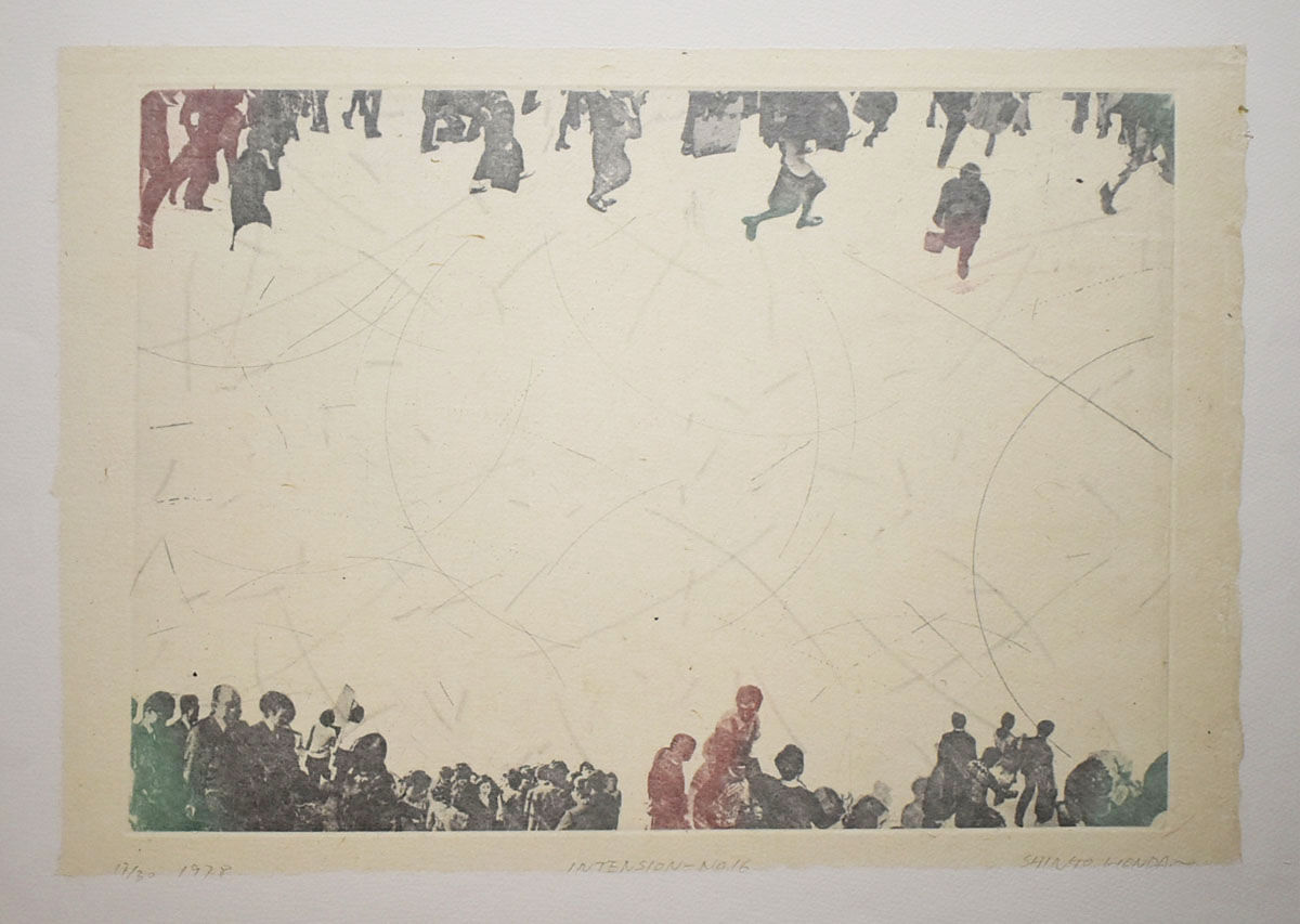 "INTENSION"(意図)シリーズも同じく人々をモチーフにしていますが、雁皮紙の風合いと刷りの加減によって人々がより抽象的な形になっています。