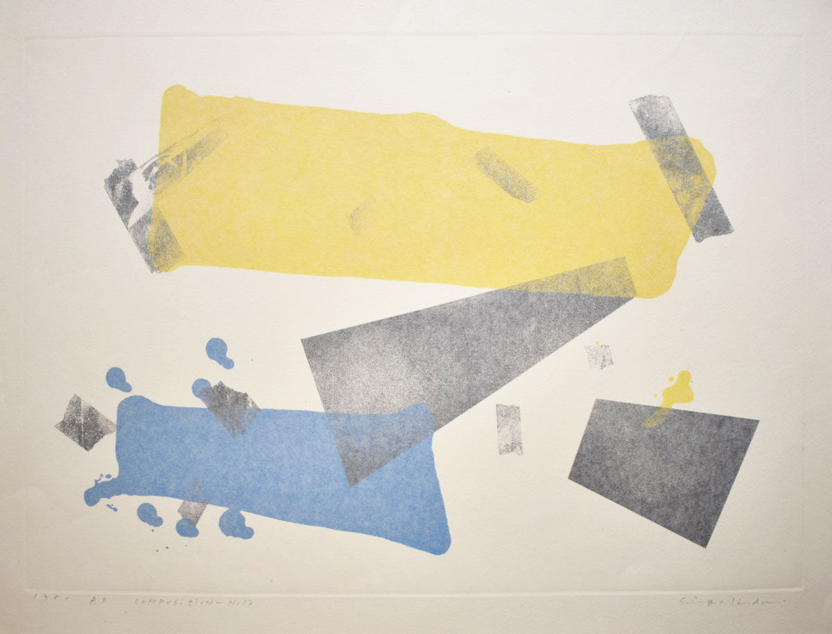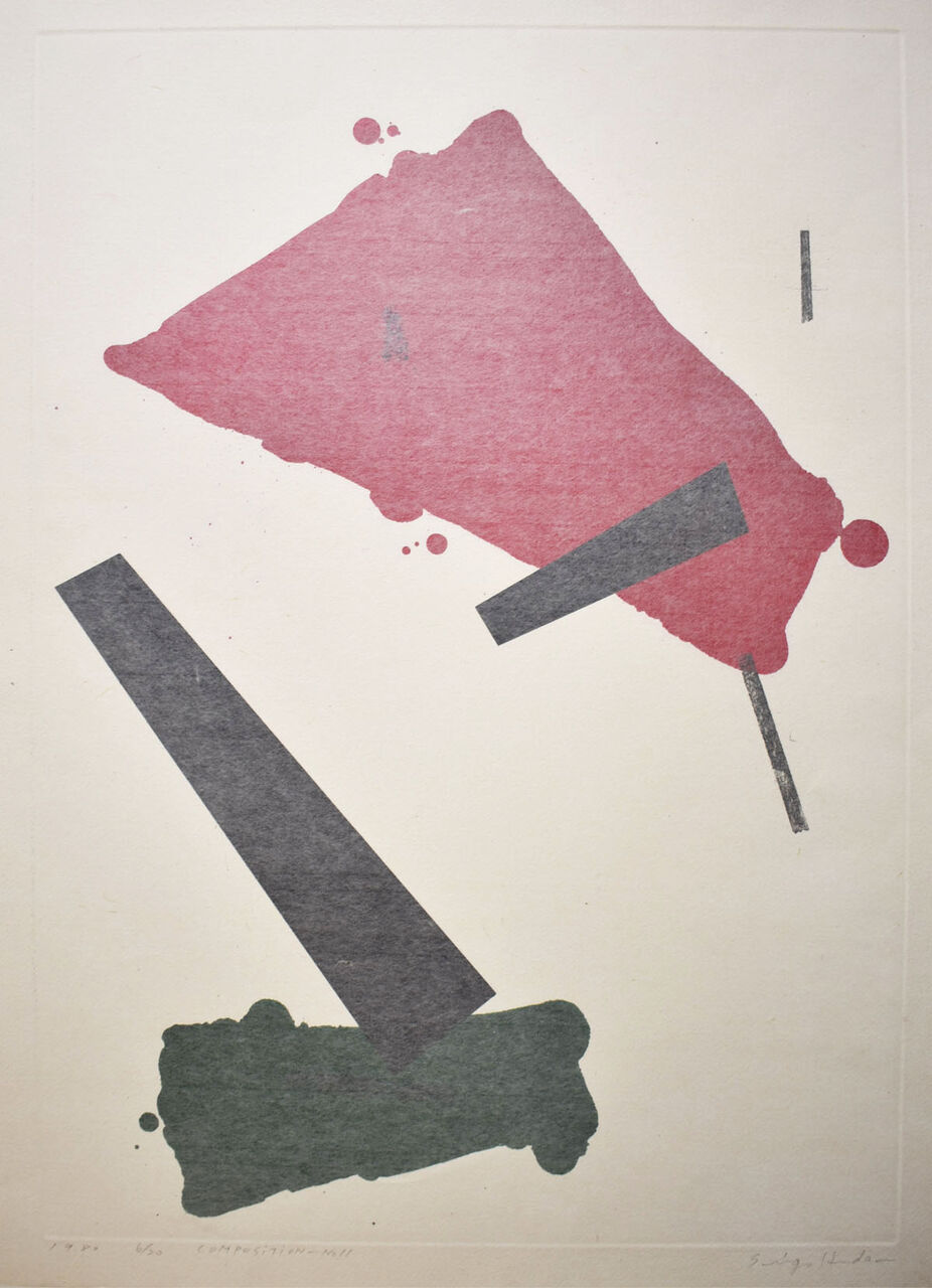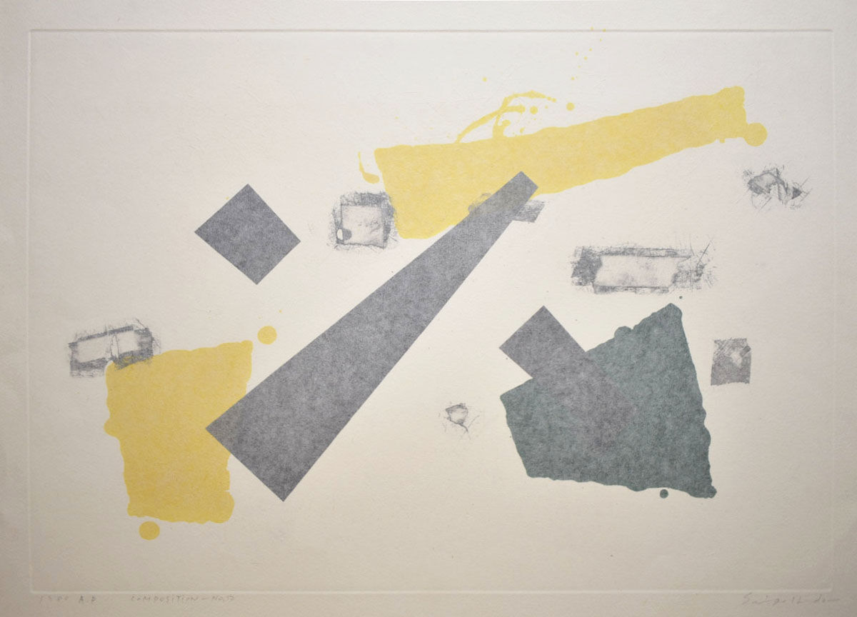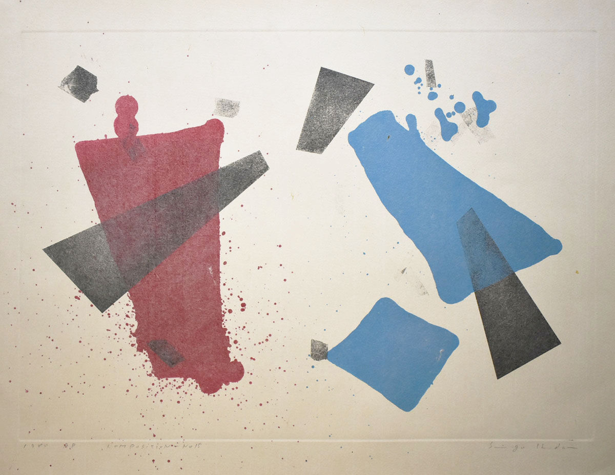 "COMPOSITION"(構成)シリーズは、シルクスクリーン+銅版・雁皮紙刷りという凝った技法で制作されています。具象的なモチーフはありませんが、直線で描かれた図形と筆で描いたような図形が重なり合っている様子は、物と物の関係性に焦点をあてた「もの派」の作家ならではのイメージが広がっています。