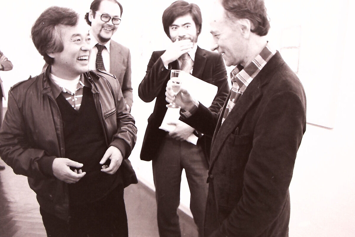 1983年12月1日「アメリカ現代版画と写真展ージョナス・メカスと26人の仲間たちー」原美術館オープニングにて。左から、靉嘔、綿貫不二夫、木下哲夫、ジョナス・メカス。