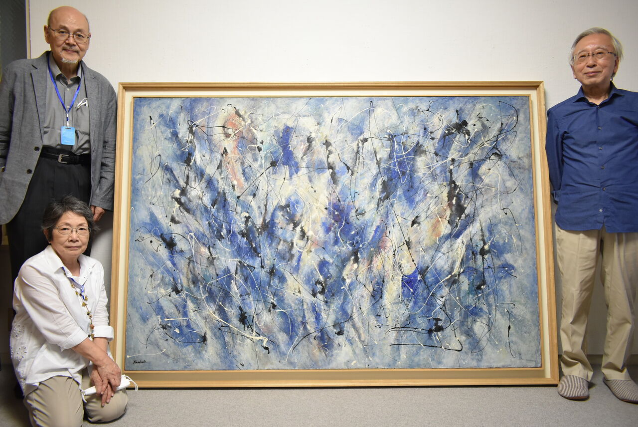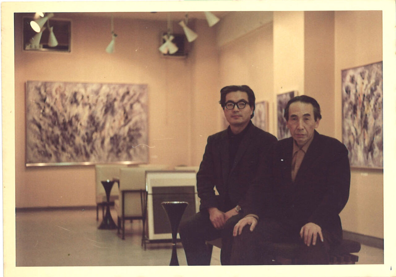 難波田武男さん(右)が50年ぶりに再会した「生命体の集合」ありがたいことに武男さんは家に残る写真アルバムを調べてくださり、半世紀も前の第七画廊の個展のオープニングの写真を探し出してくれました。