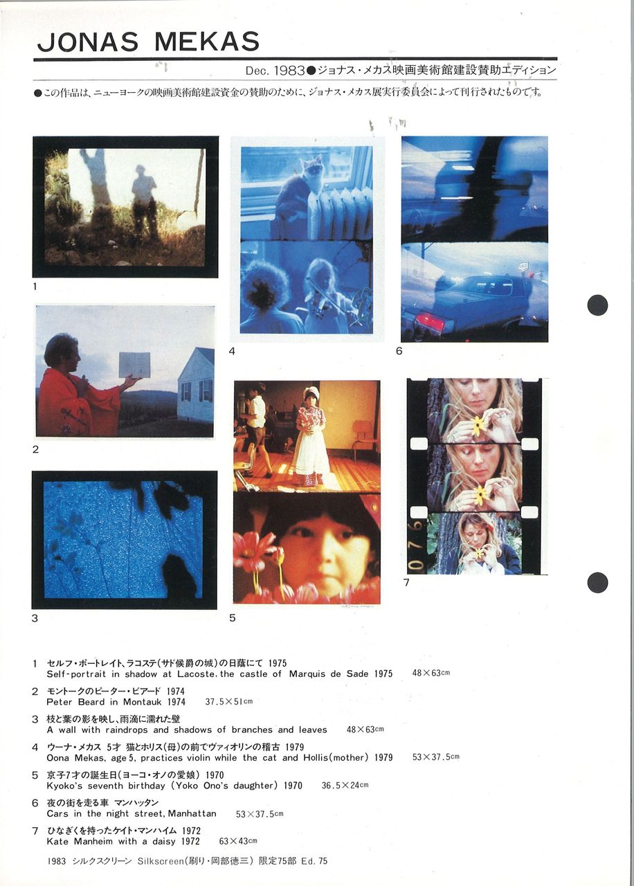 現代版画センターとジョナス・メカス展実行委員会との共同エディションとして、シルクスクリーン7点を制作(刷り:岡部徳三)、メカスさんの初めて手掛けた版画作品である。