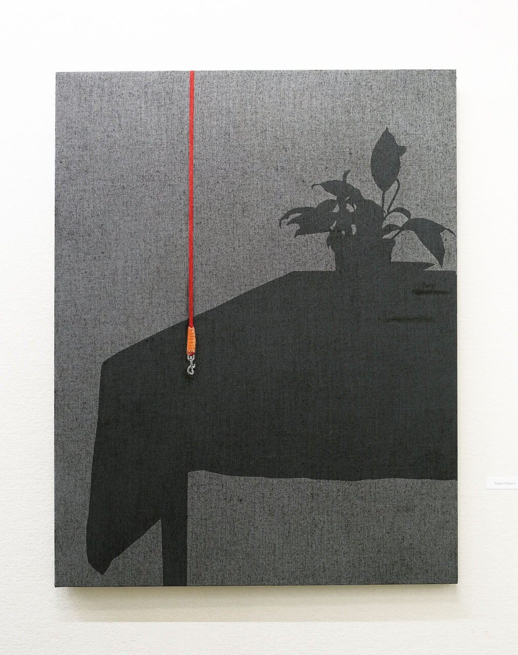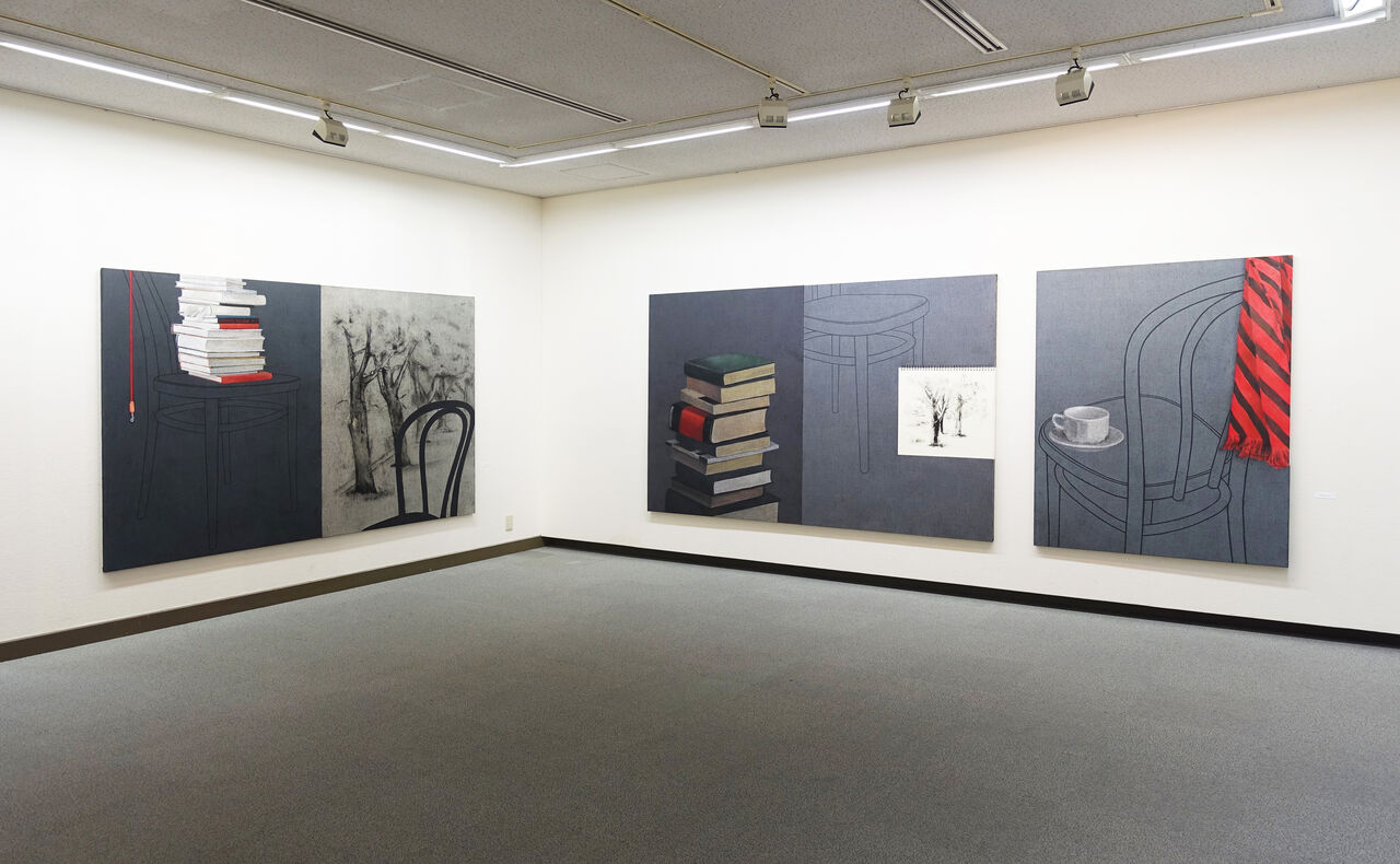 《Sound of Silence 4》と《Sound of Silence 5》は、制作中の画家のアトリエをイメージしていますが、どちらも散歩中か休憩中か、何れにしても主人公が不在なのです。この不在感を表すために、具象物を使いながらも抽象空間に転換させたいと思い、構図、素材や技法にこだわってきましたが、より深く突き詰めていった結果、絵の面積の半分を抽象化して《Sound of Silence 3》に行き着きました。私の絵を見る人は、具象的なイメージに迷わされることもあると思いますが、私は、絵画によって初めて実現できる空間というものを生み出したいと思っています。