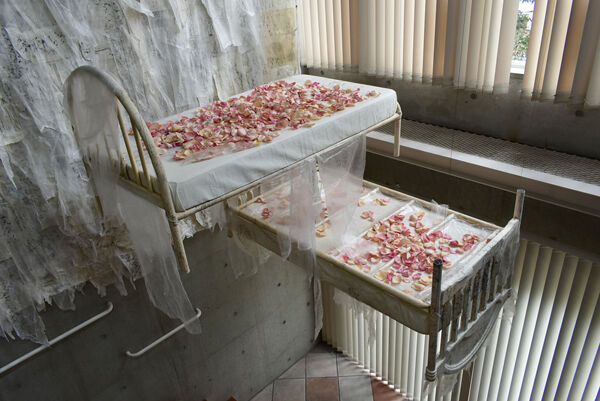 子供用ベッド2点、和紙、木炭、植木鉢、花弁、ワイヤー