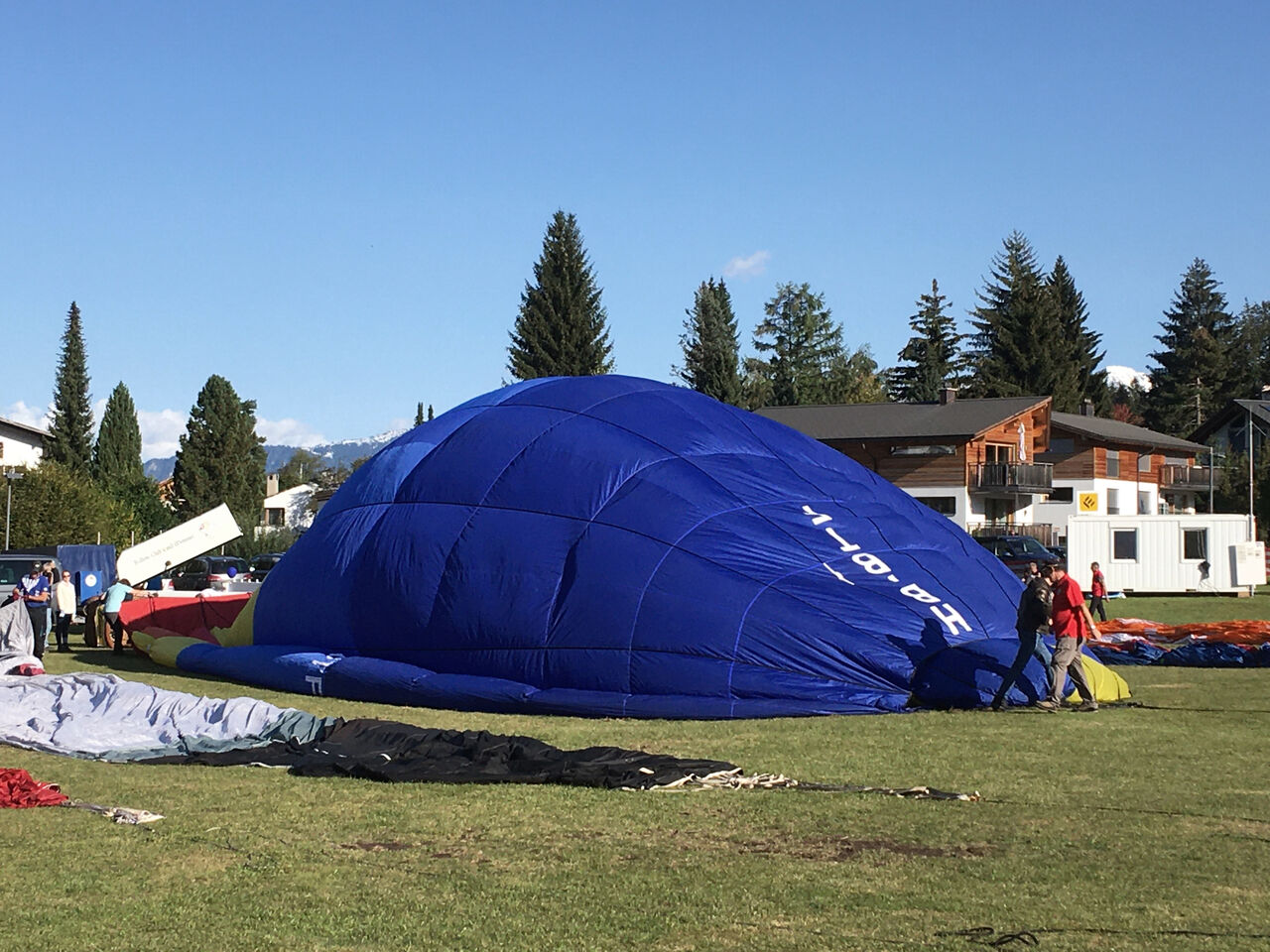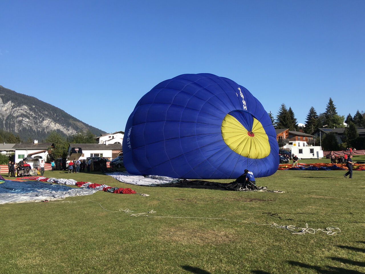 ガスバーナーとその燃料がセットされた乗客ゴンドラが横倒しになって、隣に大きな業務用のような巨大扇風機が置かれ、そばに丸まったシートのようなものが見えました。そのおそらく気球であろうシートはとてもコンパクトにまとまっている。