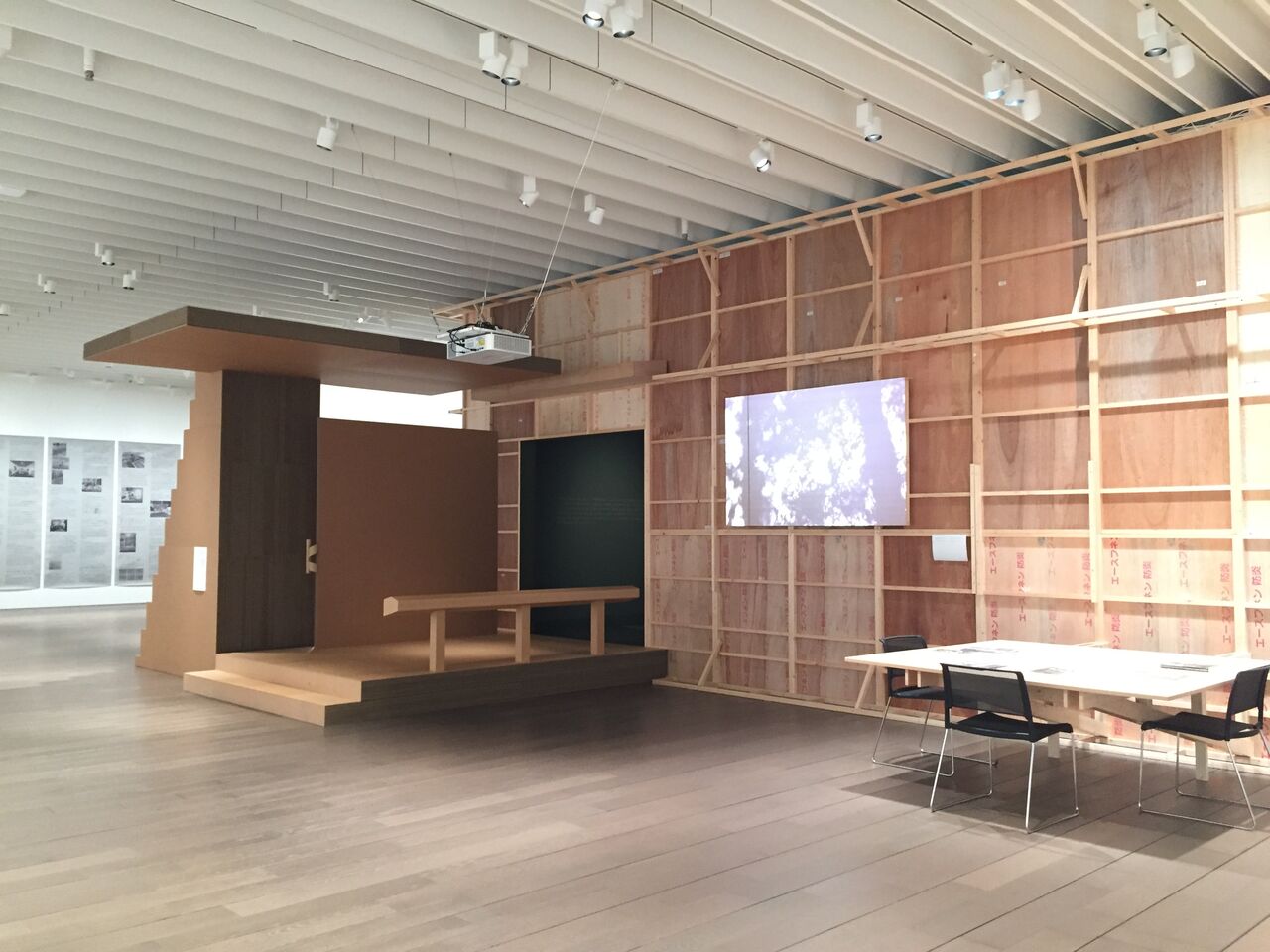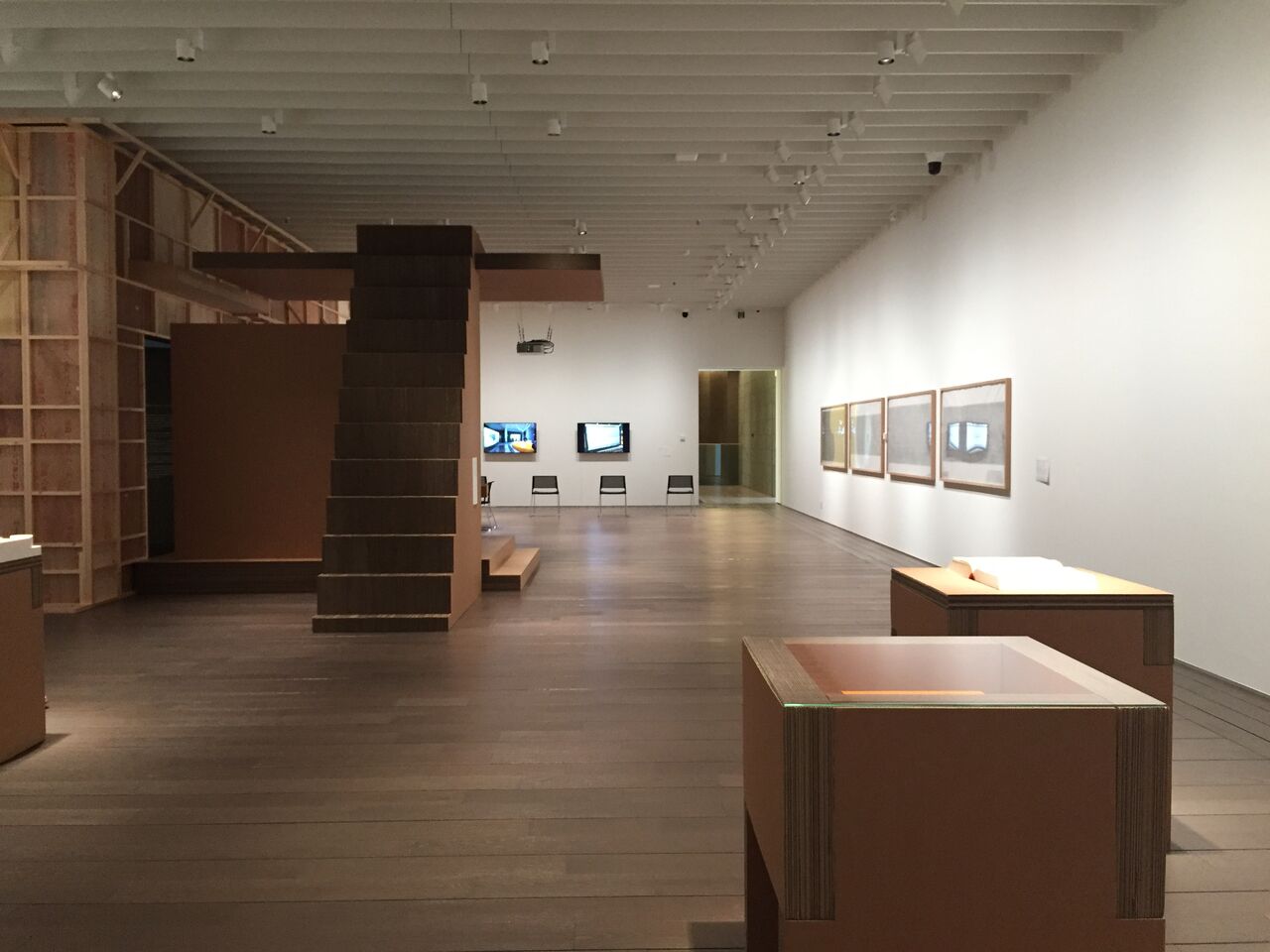 再現展示室のエントランス部分(階段と庇)は、段ボールの積層と木工で表現され、模型であること、テンポラリーで移設であること、または参考資料としての再現展示であることが強調されているように感じました。そして、この90%という縮尺ですが、実は展示物や床張り材のモジュールは実寸のままなので、身体的な違和感があり「嘘っぽさ」が面白かったです。再現展示室脇に作品搬出入用のスロープが立てかけられているところや、展示室内にある吹き抜けを見下ろすと4階展示室のビエンナーレ関連展示(過去第28回に出品作家の作品と、第27・32回に出品された作品の展示)が覗けるのは遊び心でしょうか。