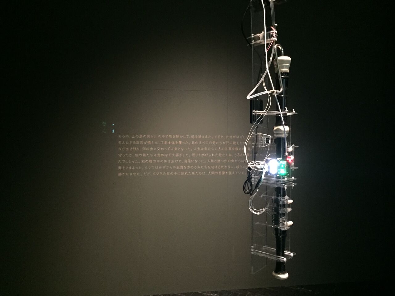 再現展示室内に入るとまず音に包まれます。これは安野氏による「ゾンビ音楽」で、伝達規則がプログラムされた12本のリコーダー(ソプラノ4本、アルト3本、テナー3本、バス2本)に空気が送り込まれることによって自動演奏で生まれる囀りです。この即興的かつ発生的な音響は、巨大な伝説上の生き物の胎内に入ったような、再現展示室自体が大きな楽器に感じられ、抽象的な別世界に没入させる効果がありました。