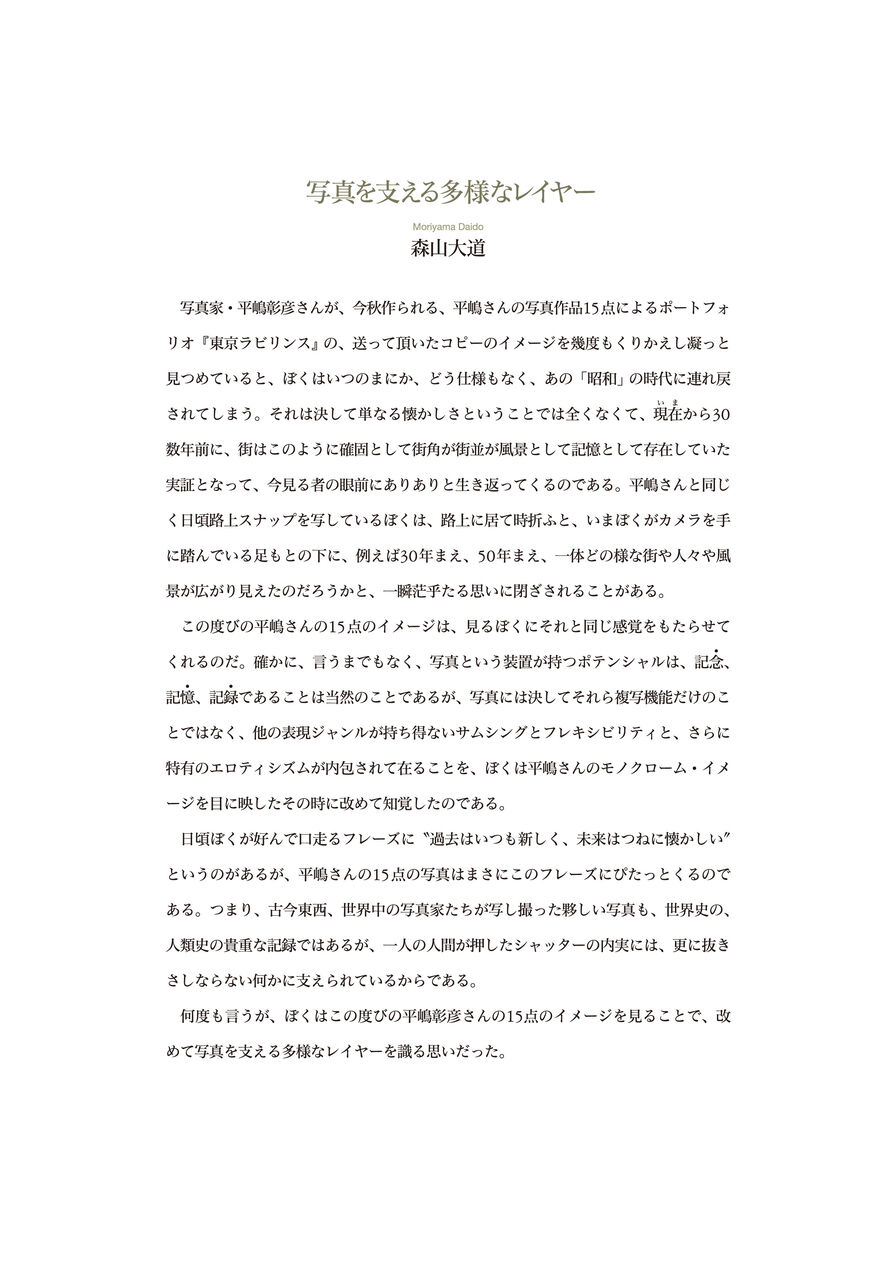 森山大道さんの「平嶋彰彦展~写真を支える多様なレイヤー」、大竹昭子さんの「東京上空に浮遊する幻の街 平嶋彰彦写真展に寄せて」もあわせてお読みください。