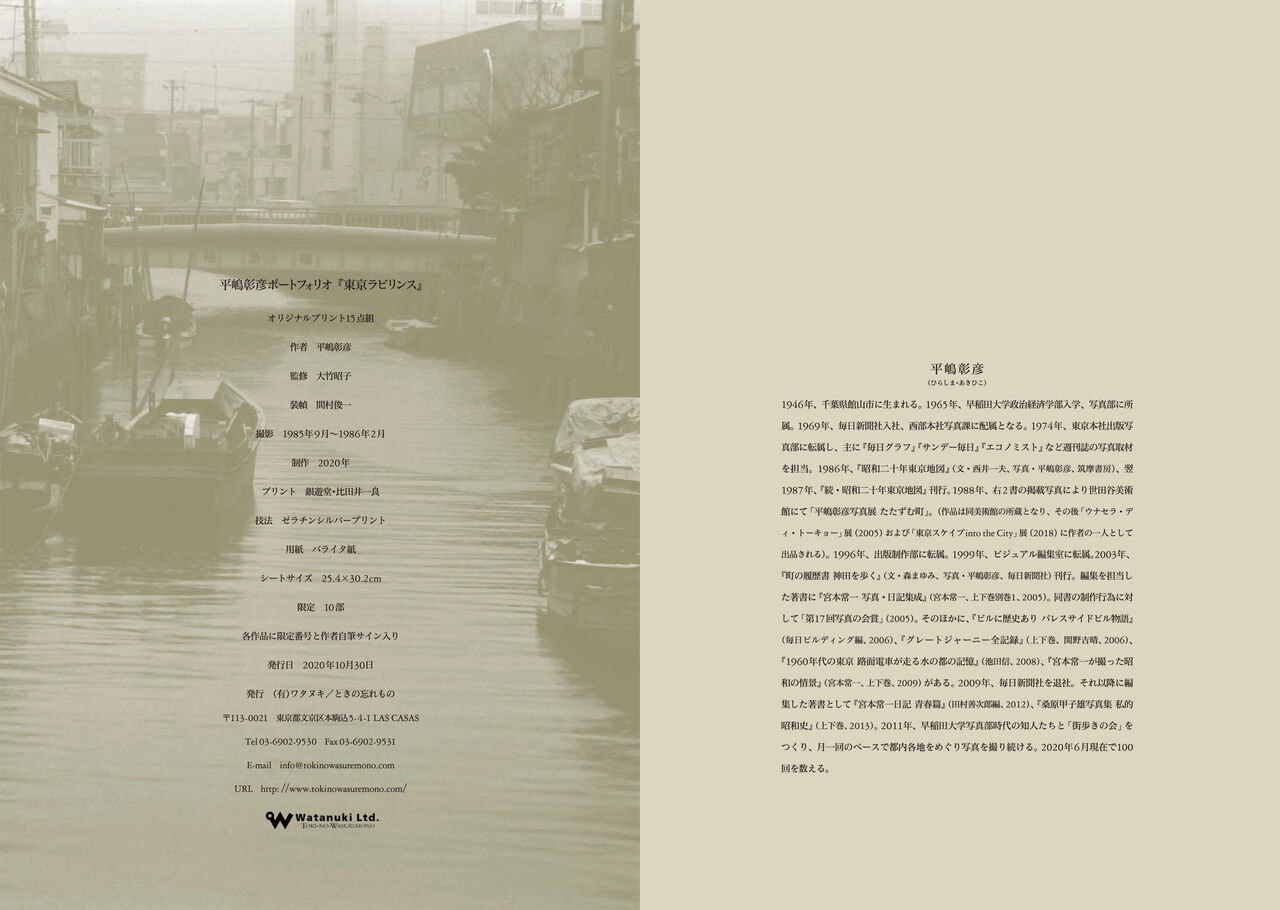 ポートフォリオ『東京ラビリンス』は、『昭和二十年東京地図』(写真・平嶋彰彦、文・西井一夫、1986、筑摩書房)の写真の中から、監修の大竹昭子さんが写真を選出し、ニュープリントしたモノクローム写真15点が収録されています。