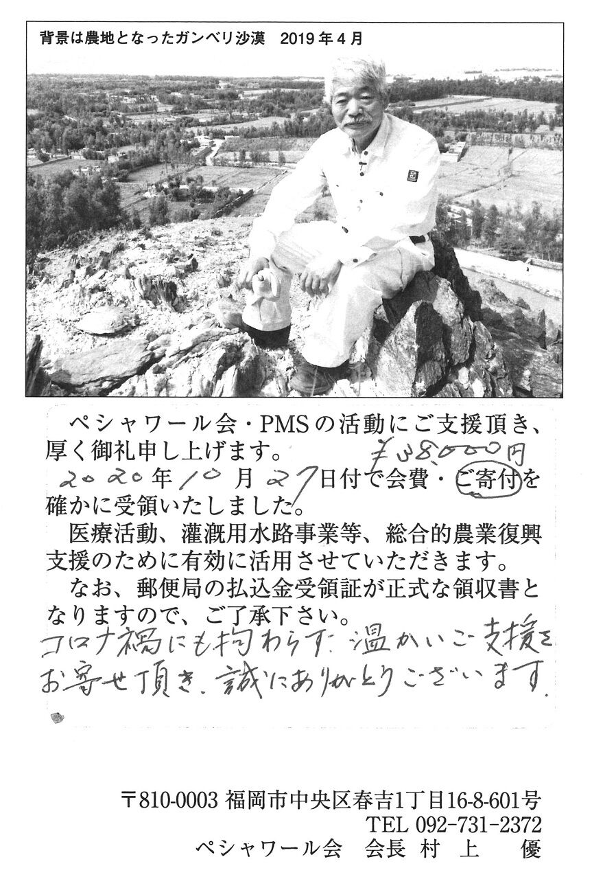 2002年以来、細々と続けてきた支援活動ですが、先月10月の支援頒布会では3点が購入され代金38,000円全額をペシャワール会に送金いたしました。送金累計は、2020年10月27日現在で3,388,736円となりました。