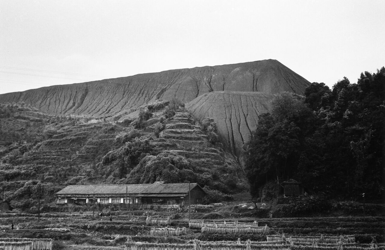 202011平嶋彰彦_ph1-189-30-a___ph1 福岡県田川市。日田から小倉への車窓から。いくつもボタ山が見える。「そのボタ山もボタを積まなくなって久しいものが多く、(中略)やがてここに木が茂り、独自な山容をもった小山が、炭坑地帯の記念として長くのこっていくのではないかと思われる(『私の日本地図11』)