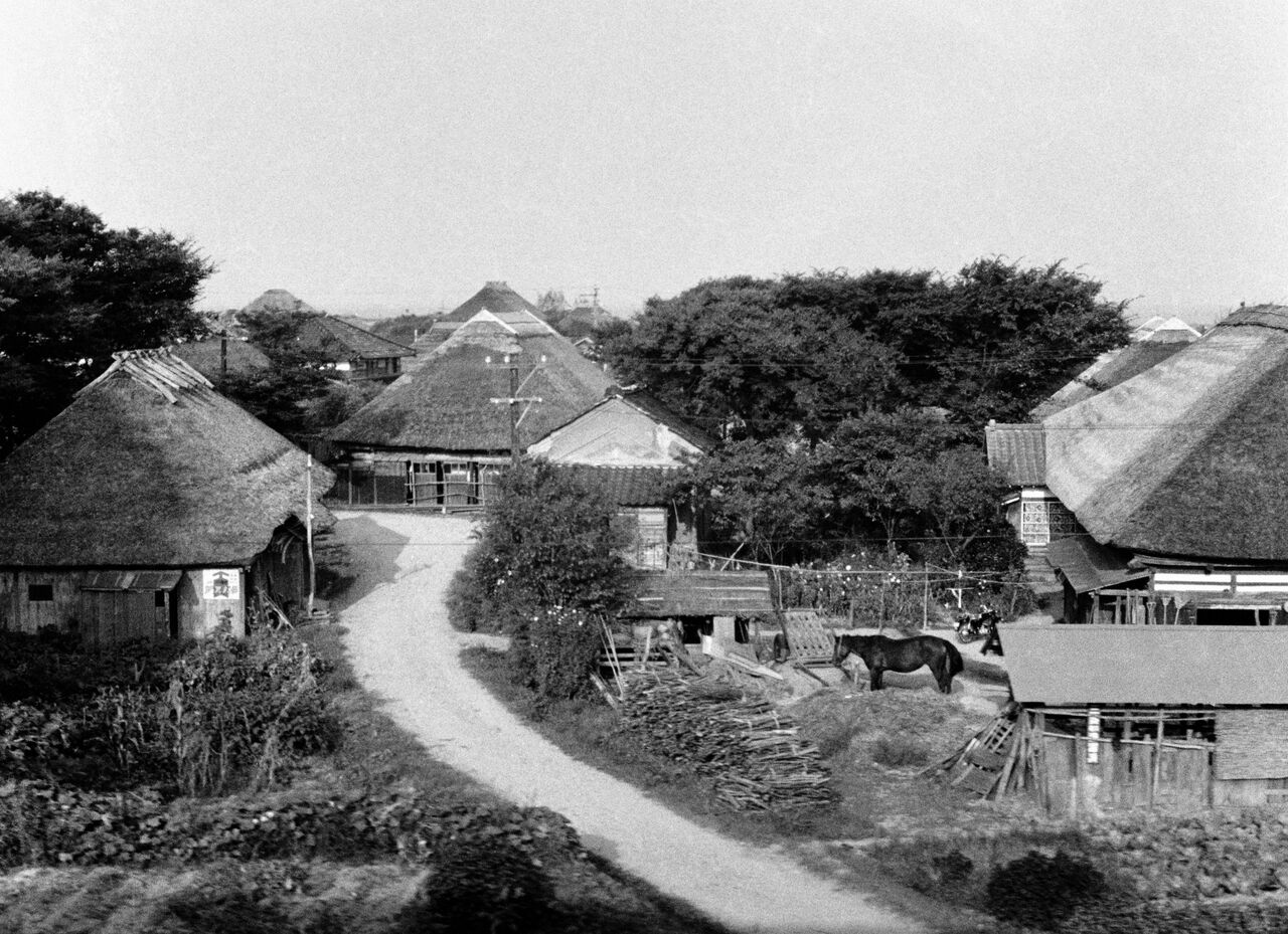 202011平嶋彰彦_ph3-621_21A-aph3 青森県むつ市から新潟県新潟市へ。車窓から。藁葺き屋根の集落。庭に馬が繋がれている。青森県内(8月29日)。「一つだけ見、一つだけ書きとめても、たいしておしえられるものではありませんが、いくつもいくつも、スケッチしたり、見たことを書きためていますと、そのなんでもないもののなかにも、たいせつな意味があったり、またそれをつくり出した人自身も、たぶん、気づいていなかったようなことまで、わかってくるのです。(中略)私は屋根の形を見るのがすきです。そして汽車の窓からながめていて、書きとめておくのですが、汽車は走っているのですから、すぐにゆきすぎてしまって、ていねいにはかけません。それでもたくさんたまると参考になることが多いのです」(『宮本常一著作集7』)