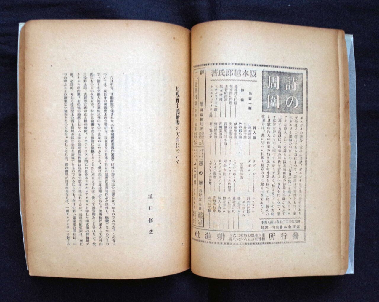 戦前期から瀧口は詩画集の重要性を説いていた。日本の画壇にシュルレアリスムを紹介し始めた最も早い時期の文献のひとつである「超現実主義絵画の方向について」(「詩法」第12号、紀伊國屋書店、1935年8月。図4)の中でも、「ぼくは影像の詩的解決を信じている。ぼくは超現実主義を通して、詩と絵画とが握手するだろうということを、さらに確信している」と記していた。こうした「詩と絵画との握手」の代表的な成果として、瀧口と阿部芳文(展也)との詩画集『妖精の距離』(春鳥会、1937年10月。図5)を挙げても、ほとんど異論はないだろう。