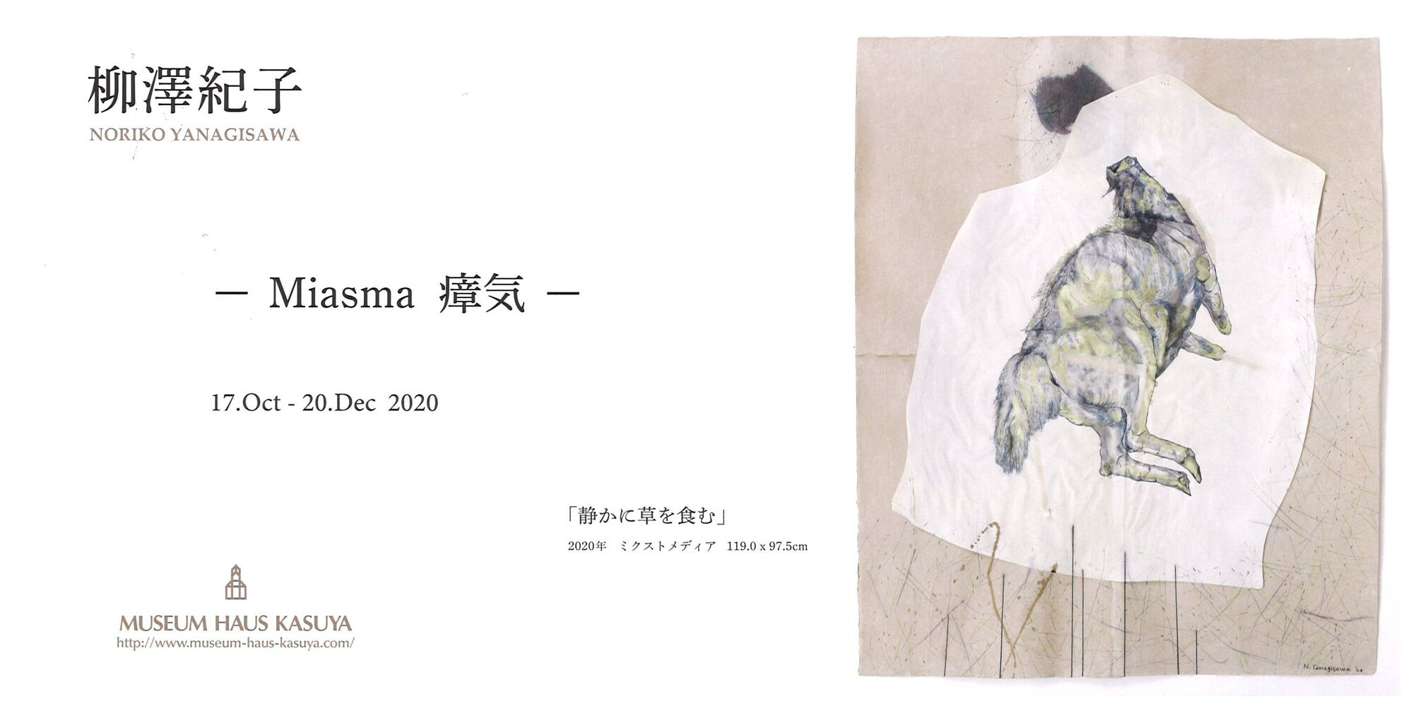 まずはカスヤの森現代美術館へ。柳澤紀子先生から送っていただいた案内状を持って「柳澤紀子 - Miasma 瘴気-」展(12月20日まで開催)を観てきました。会場の2スペースに渡って展示されていました。ミクストメディアによる動物をモチーフにした作品が多く、躍動感ある中にも強いメッセージを感じさせる印象を受けました。
