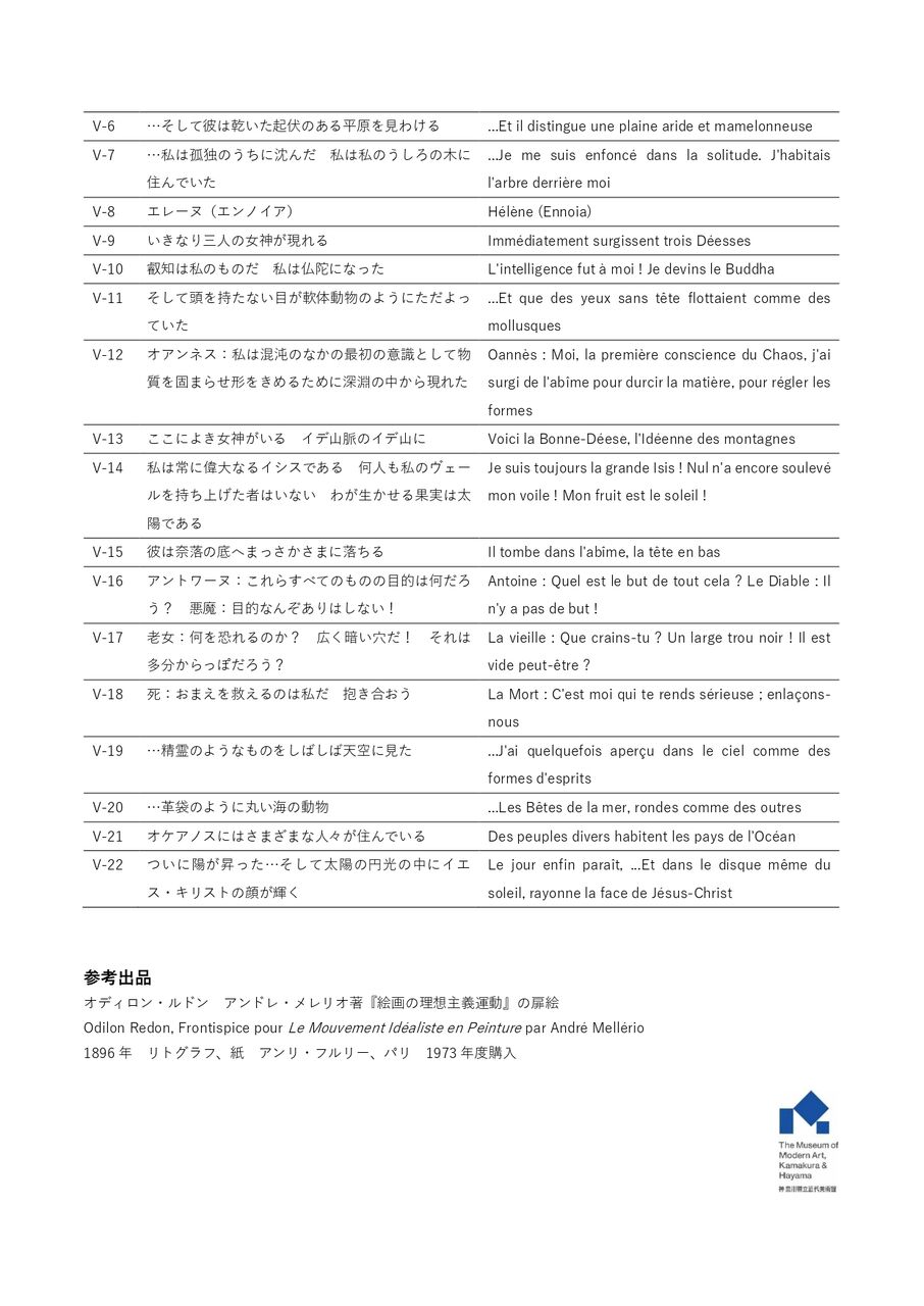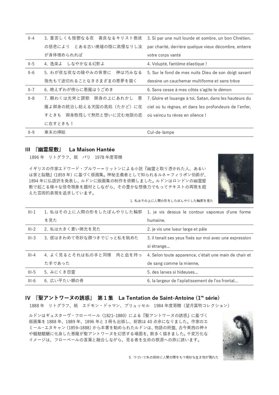本展では、神奈川県立近代美術館が所蔵するルドンの5つの版画集『ゴヤ頌』(1885)、『聖アントワーヌの誘惑』第1集(1888)、『悪の華』(1923、1890初版)、『聖アントワーヌの誘惑』第3集(1933、1896初版)、『幽霊屋敷』(1896)を展示。