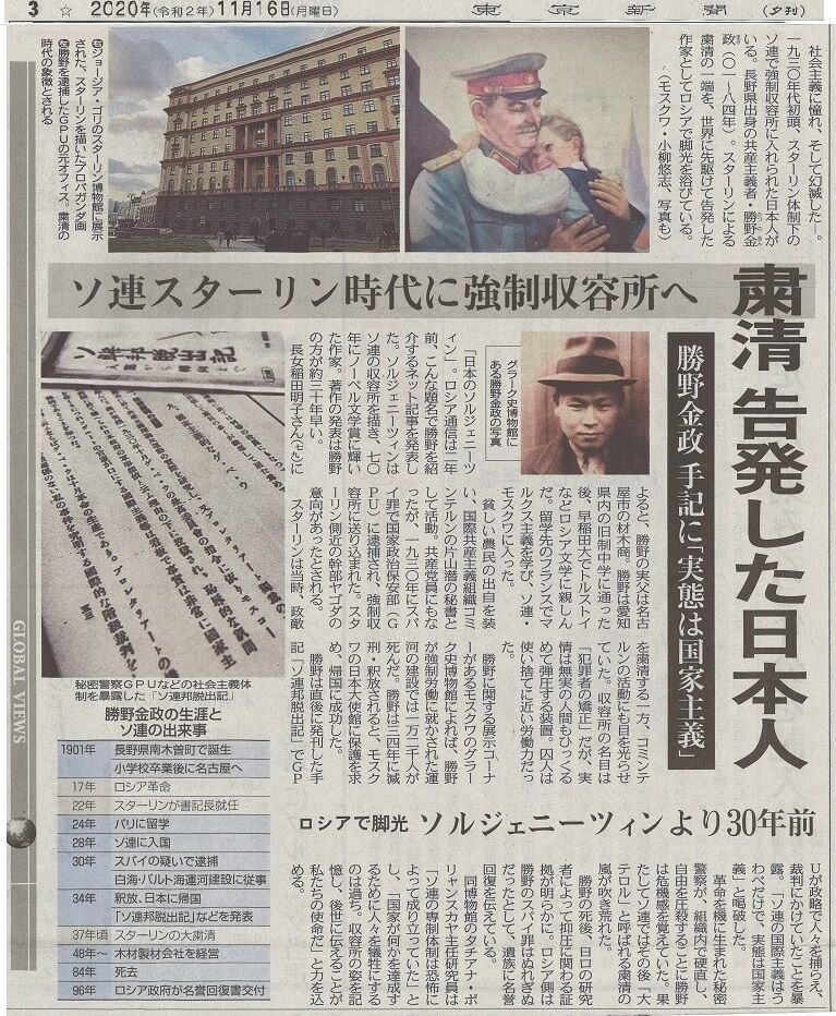 長野県生まれの勝野は早稲田大学在学中の1924年(大正13年)にフランスに留学。フランス共産党員、ソ連共産党員として活動し、スターリンの大粛清に遭遇してラーゲリに収容されながら、日本への帰国を果たした波乱万丈の生涯でした。