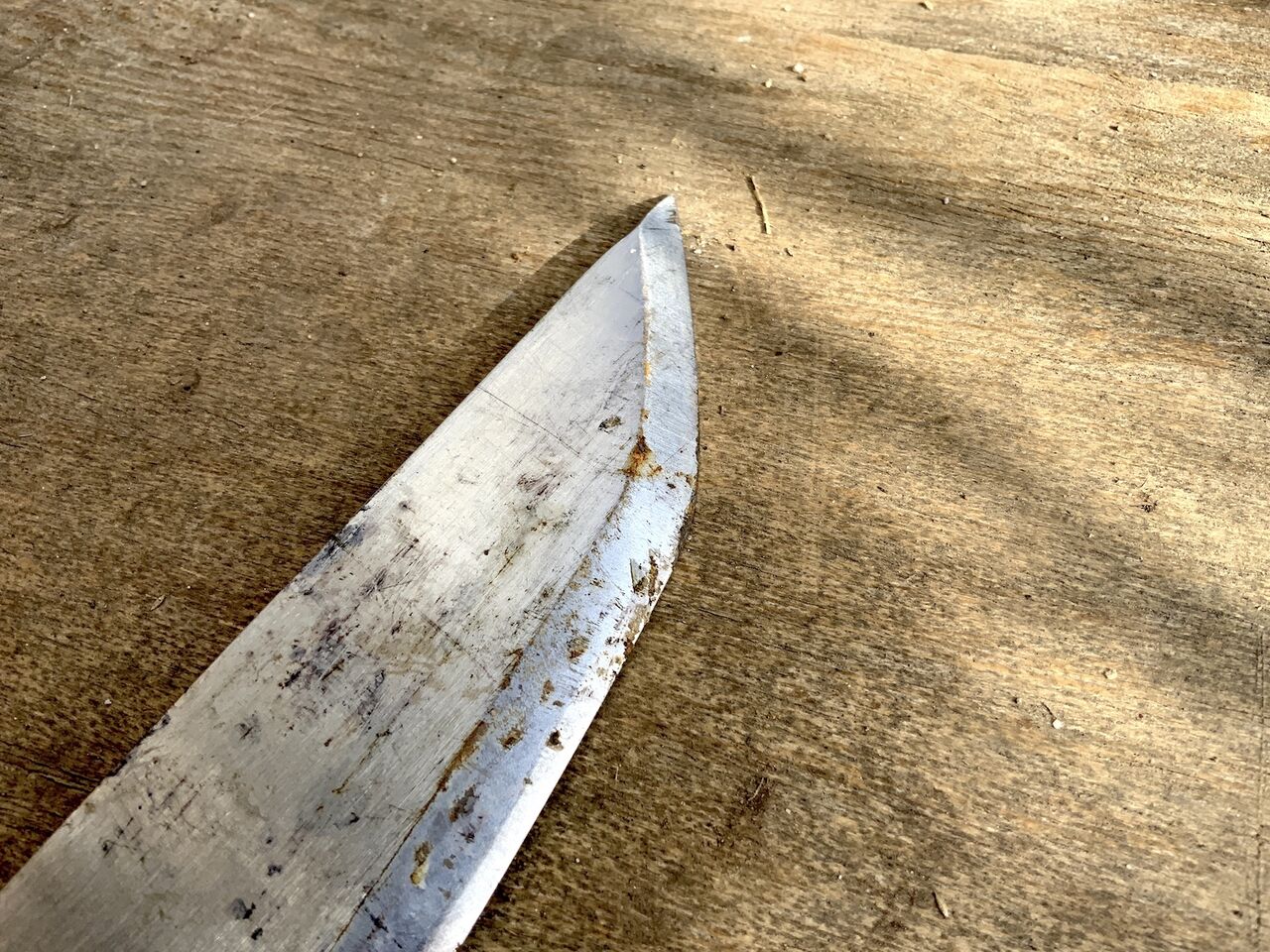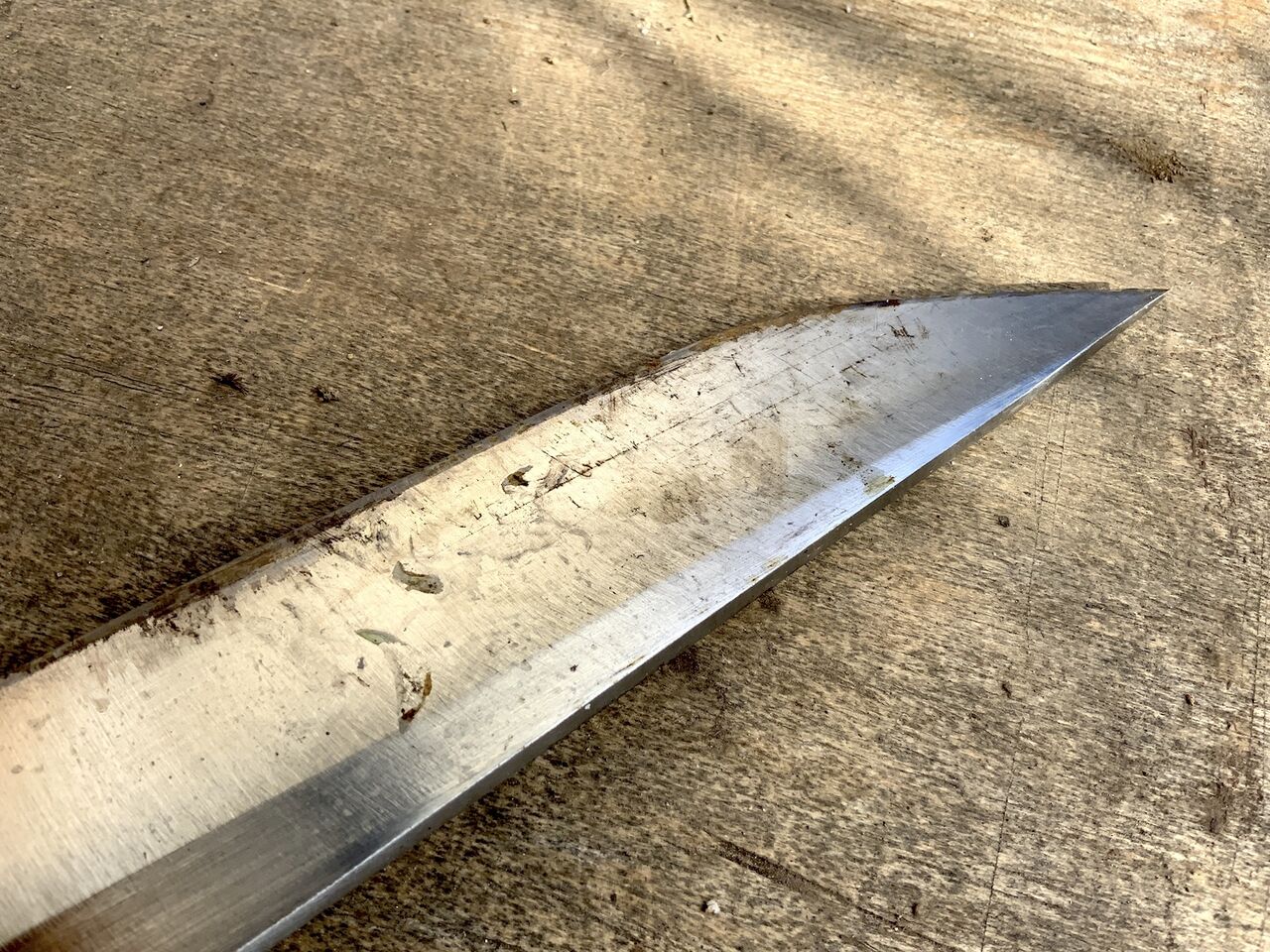 お話をうかがいつつ、自分が手に負えないだろうと分かりつつも、一つナガサを購入させていただいた。西洋のナイフともかなり違う、独特なアールがついた刃先をしている。一般的な鉈と同じく片研ぎの刃で、裏側は裏スキがなされている。なんとなく鉈の要素を引き継ぎながらも妖美な姿形をしたかなり変わった造形である。この造形はなにかこれから作るモノのきっかけになってくれそうな気はしている。