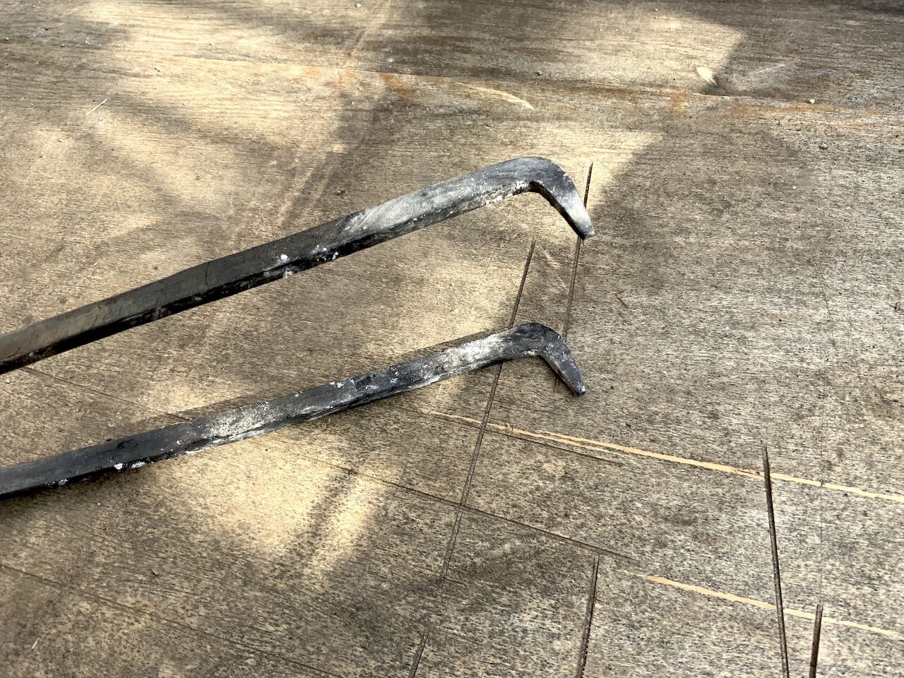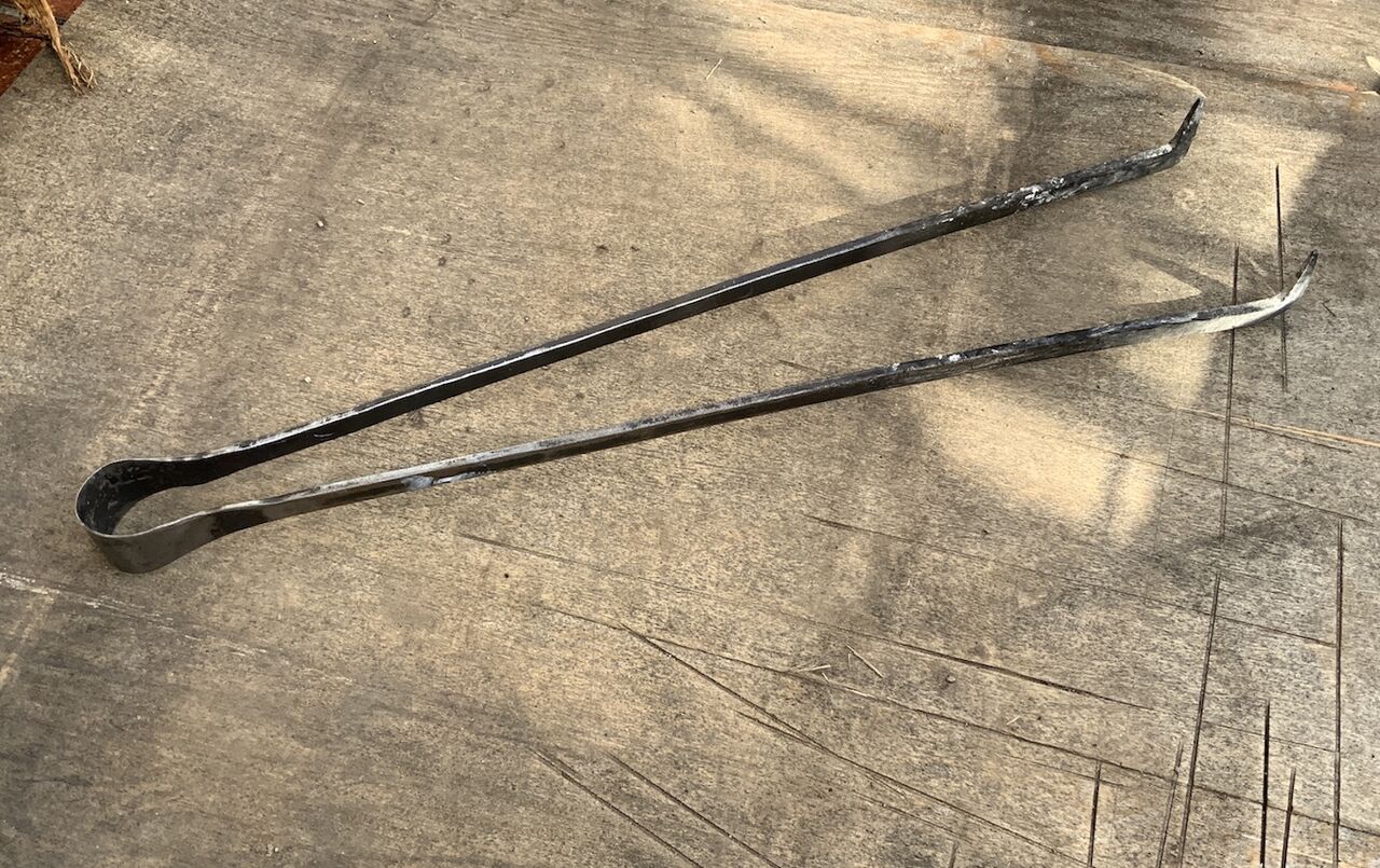 西根さんのところではもうひとつ道具を購入させてもらった。薪ストーブで使うトングである。手打ちのトングとはなんと贅沢な、と思われるだろうがそれだけではなく、このトングは絶妙なバネ感があり、先端は薪ストーブ(特に時計ストーブ)の上フタを掴みやすいようにL字に折れ曲がっている。西根さんのところでは先代の方がおよそ50年前に考えて作ったこのトングをまだ現役に使っていた。そしてそのトングと同型を近年改めて作り始め、販売を始めたのだそうだ。この造形と塊感もかなり面白い。トロみのある黒皮の表面とその柄の細さ、そして根本のバネの感触は、鉄という素材の特性がそのままに露出した正直な形をしている。