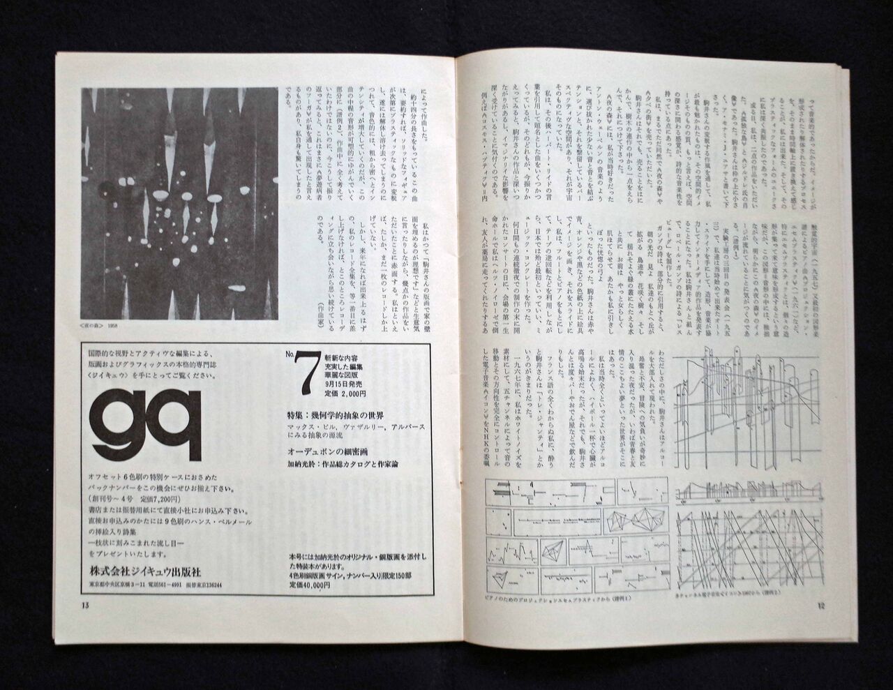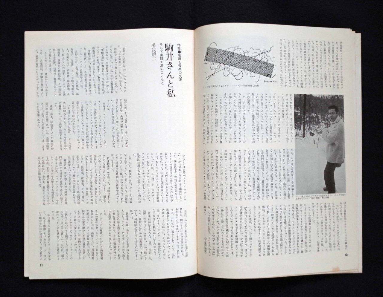 他のメンバーにとって駒井がどのような存在だったかの一例として、湯浅の回想「駒井さんと私 そして実験工房のことなど」(「プリントアート」第17号、プリントアートセンター、1974年8月。図22~24)を見てみよう。それによると、「造形の駒井さんと、北代さんが私にとっては、あきらかな先輩であった」とされ、北代は「むしろエンジニアといった雰囲気をもっていた」のに対し、駒井は「とにかく私にとって、芸術家そのものとして映った[中略]私が身近に出遇った最初の芸術家であった」と述懐している。湯浅はしばしば駒井の家を訪れ、音楽、文学、美術の話をしたり、制作中の銅版画を見せてもらったり、何点か譲ってもらったりしたそうで、高城重躬(マニアの間でも有名だった岡鹿之助のオーディオ・システムの製作者)の家に連れて行ってもらった時には、駒井が岡のアトリエで聴いたメシアンの話をするのが大変うらやましかったとも記している。ビュランの連作「夢遊病者のフーガ」を見た際のことも、「ひどく感動した。それは、フーガという題のせいだけではなく、全く私にとって音楽的であったからだ。イメージが形成されたり解体されたりするプロセスを、そのまま時間軸上に置き換えて感じることが、私には出来た。そして、そのプラスティックなフォームのユニークさに私は深く共振したのであった」と回想している。まるで現代音楽の図形楽譜のように捉えているのは、作曲家ならではだろう。こうした駒井その人への尊敬や、作品から受けた感動が、上記の共作「レスピューグ」として実ったと思われる。