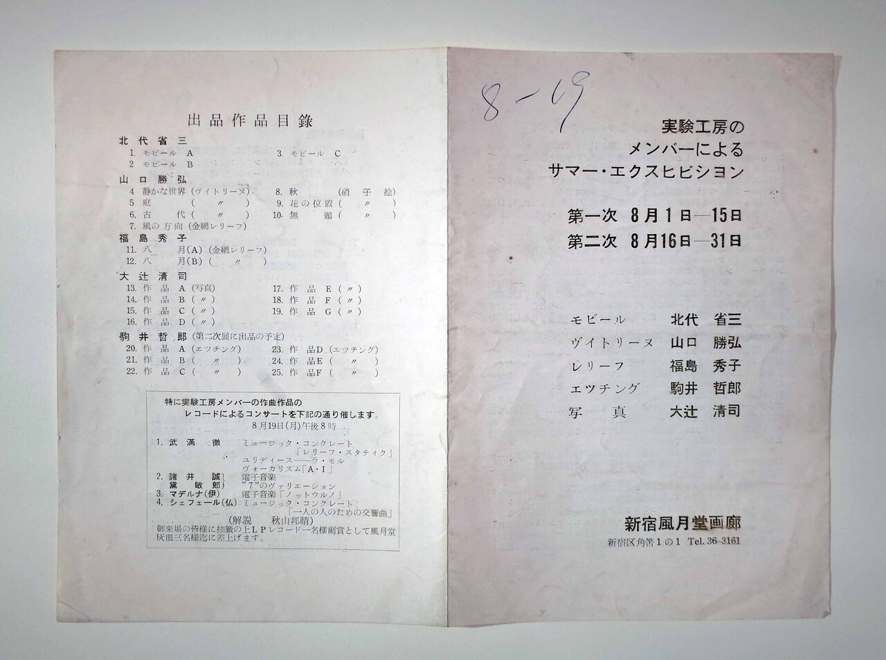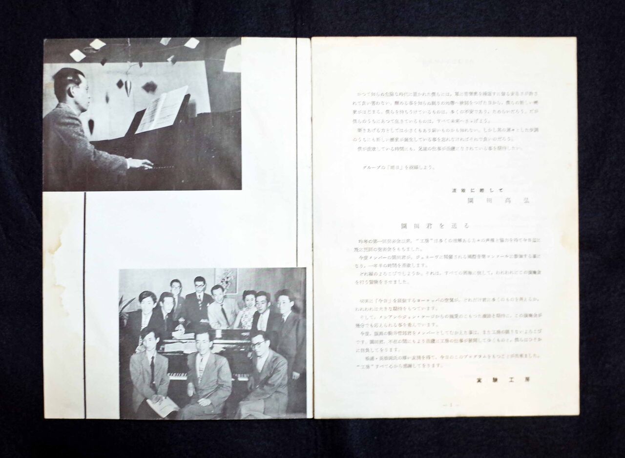 参加後、湯浅譲二との共作のオートスライド「レスピューグ」(1953年9月の第5回発表会で発表)のような顕著な成果も残し、間にフランス留学(54年3月~55年12月)をはさんで、帰国後も、グループとしての最後の活動とされる「実験工房のメンバーによるサマー・エクスビジョン」(前期:57年8月1日~15日、後期:16日~31日、新宿風月堂画廊。図21)に参加している。