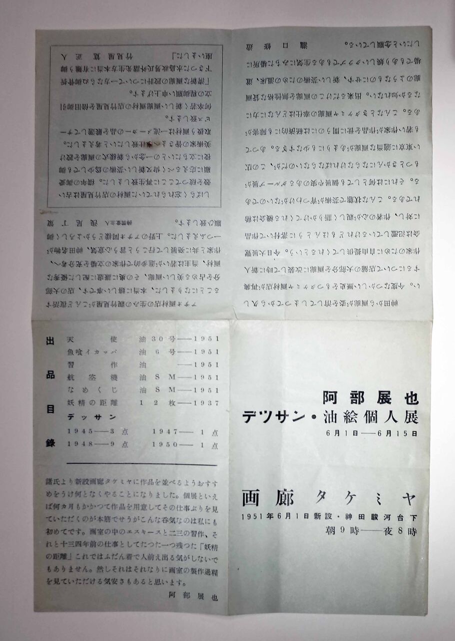 『マルドロオルの歌』に着手した頃の1951年6月13日付け手紙(参考文献2)には、駒井が阿部展也の展覧会で瀧口・阿部の詩画集『妖精の距離』(前出図5)を見て、「なかなか面白かったし、また参考になりました。それで瀧口氏の詩、六つ、会場で手帳にうつしてきました」と記しているが、この阿部展也展とは瀧口が企画・運営を引き受けて、ちょうど開廊したタケミヤ画廊の第1回展「阿部展也デッサン・油絵個人展」(1951年6月1日~15日。図14)と思われる。