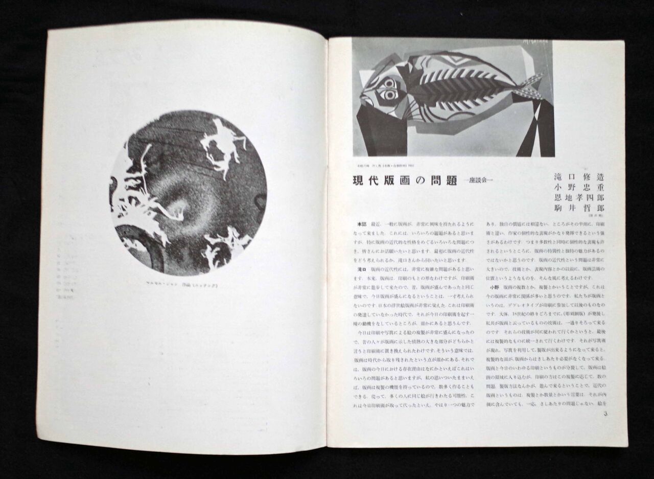 「現代版画の問題」は瀧口、恩地、小野、駒井という豪華な顔ぶれによる座談会で、「みづゑ」誌1952年3月号の巻頭に掲載された。『コレクション瀧口修造』には収録されていない。図版として駒井のエッチング「箱の中の蒐集」(上掲図12右)、小野の木版画「河岸」など、15点が掲載されているが、恩地の作品は見当たらない。理由はわからない。座談会では版画の複数性・芸術性や、版画の技法、伝統、社会的状況など、さまざまな主題をめぐって、各氏が自らの考えを率直に述べている。考え方の違いなども興味深く、なかなか充実した内容であるので、長文ではあるが再録することとした。