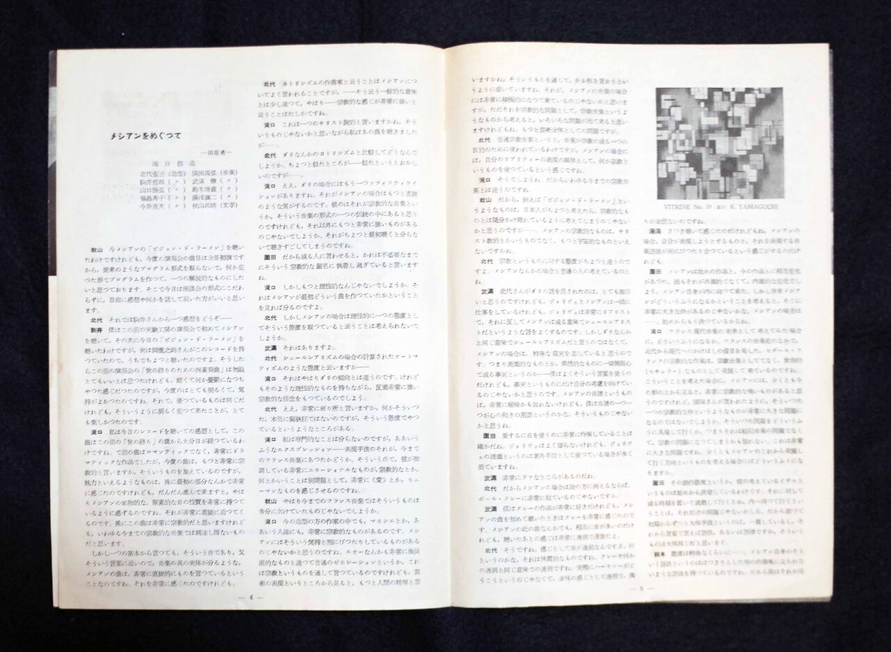 これに関連して、実験工房への参加についても触れておきたい。駒井は1952年8月に瀧口の推挙により実験工房に参加したとされている。第4回発表会プログラム(図18)には、扉に園田高広が「渡欧に際して」を寄せ、これに対して実験工房が「園田君を送る」と返している(図19)。その末尾近くに次のような一節がある。「今度、版画の駒井哲郎君をメンバーとしてむかえた事は、また工房の限りないよろこびです。園田君、不在の間にもより活発に工房の仕事が展開してゆくものと、僕らはひそかに自負しております」。そしてメンバーと瀧口による座談会「メシアンをめぐって」(同プログラムに収録。図20)にも早速加わっている。
