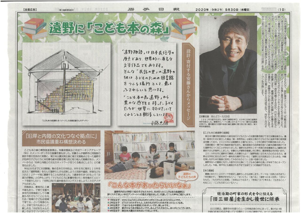 また岩手県のお客様からは<安藤忠雄さんがこども図書館を遠野市に寄付>という新聞記事を送っていただきましたのでご紹介しましょう。