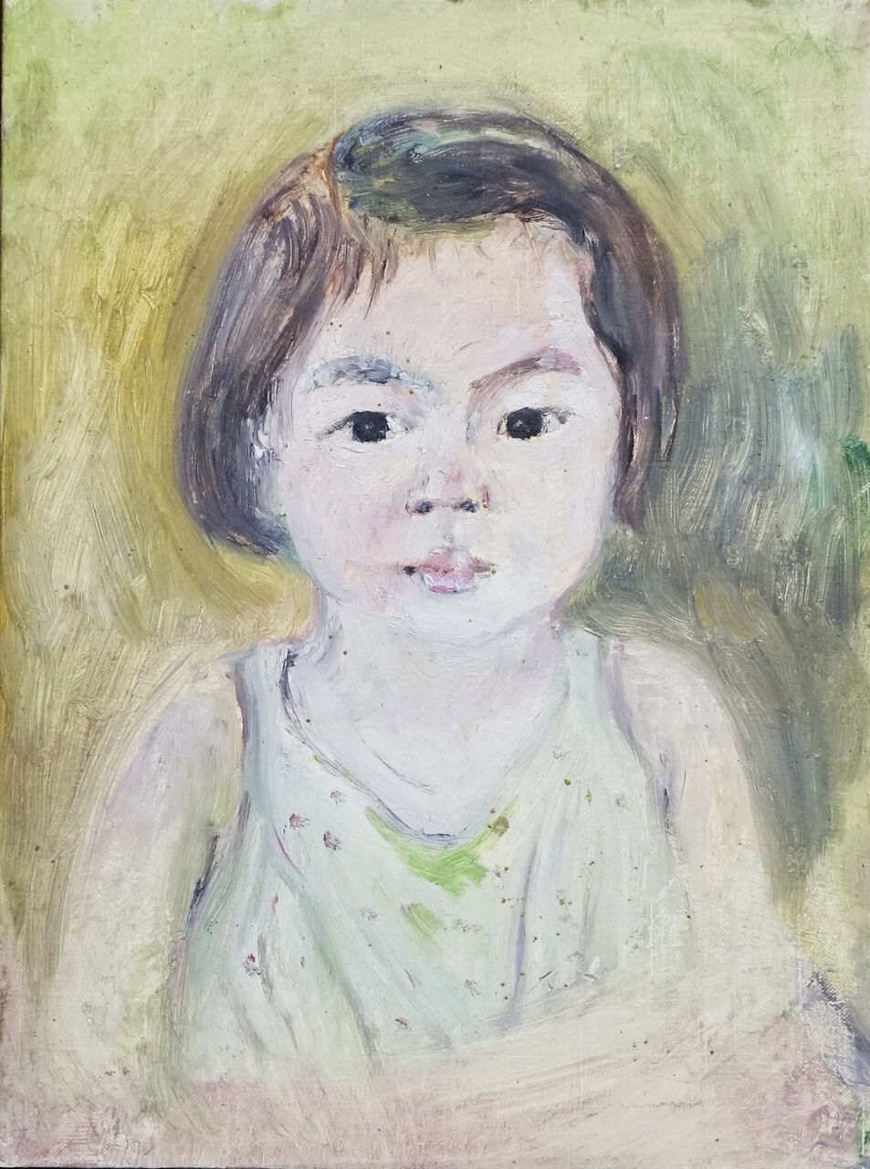 《えりの像未完》油彩、ボード 吉原英雄 1962年頃小さい頃は、絵を描くことも物語を空想することも大好きだったけれど、だんだん理数系の方が好きになり、実験や難解な問題を解いたりすることが楽しくなりました。丁度その頃、父が教えていた大学の学生だった木村秀樹さん(のちに私の大学での恩師となる)や田中孝さんを中心にたくさんの学生や、リトの刷りを手伝う若い人たちがひっきりなしにうちにきて話し込んだり、飲み明かしたり、泊まり込んでいました。そのため、母はたくさんの食料を買い込むので、買い物に行くたびに、近所の人から「オタクは何人家族?子供さんが多いんやね?」と言われて答えに困ると言っていました。初めは、ほとんどが男子学生だったけどそのうち綺麗な女学生も来る様になって、バランスのとれた普通の女子学生が絵描きになるのかと、子供心にも時代が変わって来たことを感じました。その中でも、他の美大生が苦手な理数系が好きだという山本容子さんが私にとってはすごく新鮮でした。数学が好きだというのに、言葉遊びでタイトルを付けたり、連想ゲームの様にイメージを繋げたりしながら作品を作るその姿に、自由を感じました。また、芸術論を闘わせる男子学生の横で、賢いはずの容子さんが「もうそんなめんどくさいことはいいから、愛の話をしようよ。」などと言う彼女にびっくりしました。と同時にこんなに自由に絵を作っていいのなら物作りも面白いかなと思う様になっていきました。そんなわけで絵描きにだけはならないと思っていたのに、高2から、美大受験のための予備校に通い始めると、もの派やコンセプチャルアートの影響をうけて、彫刻がカッコよく思えてきました。それでも父が、「彫刻は材料代だけでなく、広いアトリエがいるし、倉庫もいる。うちにはそんな財力は無いから、彫刻科だけはやめて欲しい」「親子でも、アーティストがアーティストを食べさせるのはおかしいから、卒業と同時に自活できるように考えろ」と言ったので、一番小回りの効きそうな版画科を選んでしまうことになります。父も私を版画家にしようと思って言ったわけではなく、私が、消去法的選択で考えた結果です。また大学に入る前から、父吉原英雄も、山本容子さんも人物をモチーフにしていたので、人物を描かないというところからスタートすることが得策だと思いました。そのため、学生時代の初めの頃はメモシリーズの制作に没頭し、専攻科に進んだ頃から人物がいなくなった瞬間の風景画を描いていました。