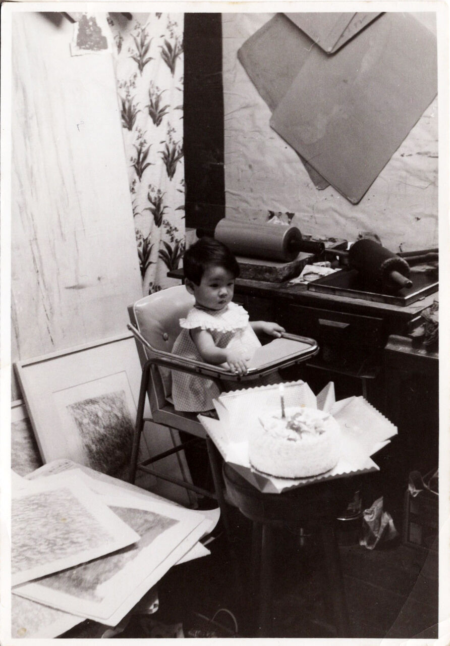 家の真ん中がアトリエで、一階の大部分を占めており、そこには、大きなリトのプレス機が陣取っていて、ごく幼い頃は、床で制作中の父のタブローの上に、私が乗ったり座ったりして邪魔をしない様に、柱に紐で括られていました。今だったら、虐待とも言われかねないですね。父の機嫌が良い時は、高い天井の梁に吊られたブランコに乗せてもらい、片足で蹴って私がはしゃいでいる間に下で絵を描いているということもあったようです。父が連れて行ってくれたところは、いつも美術館か画廊。子供のためのサービスでお出かけする気など全くないのです。美術館では、子供の視点からは、あまり絵が見えないのに、「どうや、いい絵やろ?」下手にいいねというと何処がいいか、何故そう思うかと、質問を浴びせてくるので大嫌いでした。だからいつも美術館に行くと私は下ばかり向いて、今日はブーツの人が何人で、ハイヒールの人が何人などと数えて歩いていました。また、当時毎晩のように、子供嫌いの画家仲間や評論家が父のアトリエに来てお酒を飲んで芸術論を闘わせていました。朝、私が二階から降りると何人かがアトリエに布団もひかないまま転がって眠っていて、その人達を飛び越えながら幼稚園に通っていました。