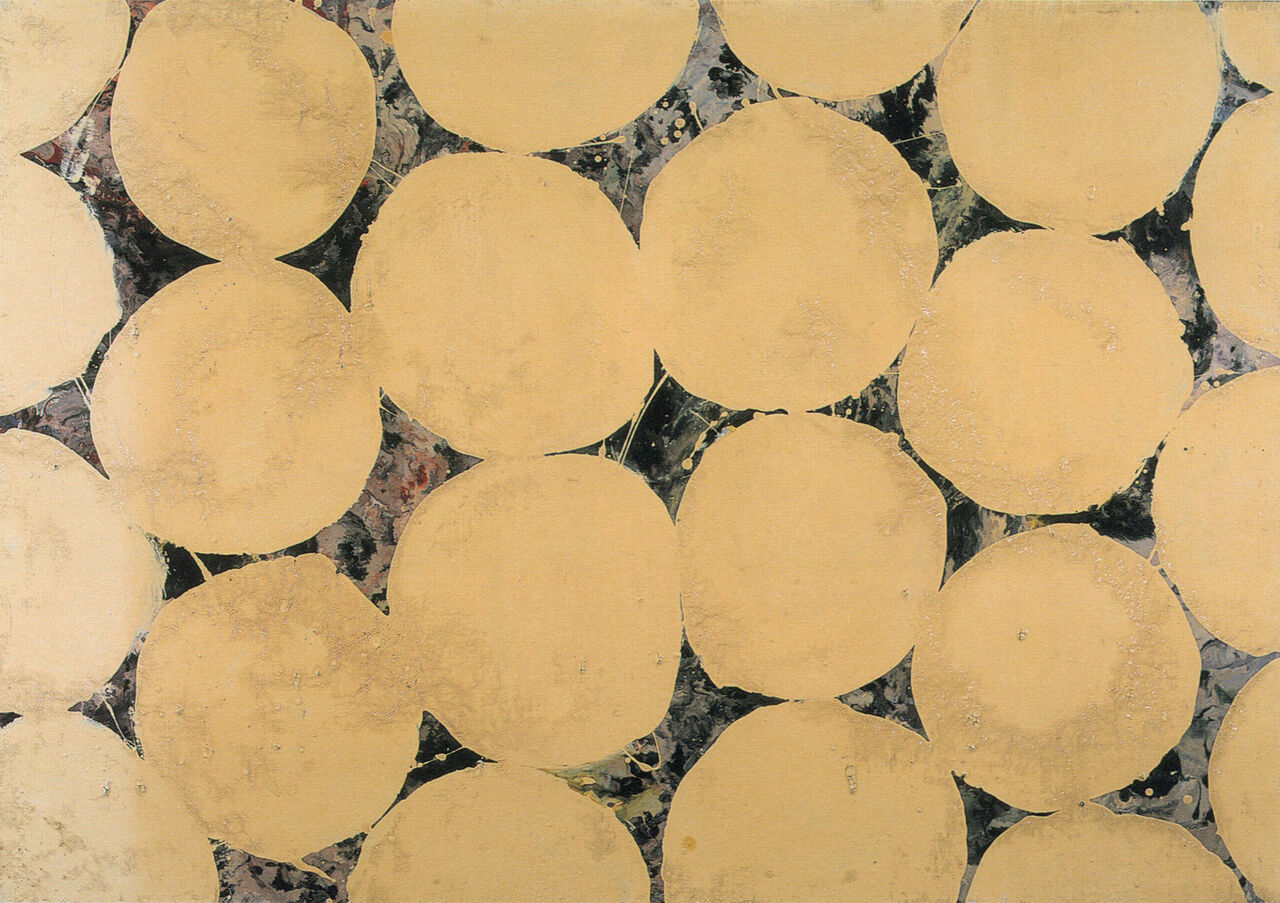 《作品W-2》エナメル、カンヴァス 吉原英雄 1961年(制作中、私がエナメルの画面に乗らない様、柱に括られていた頃の作品)
