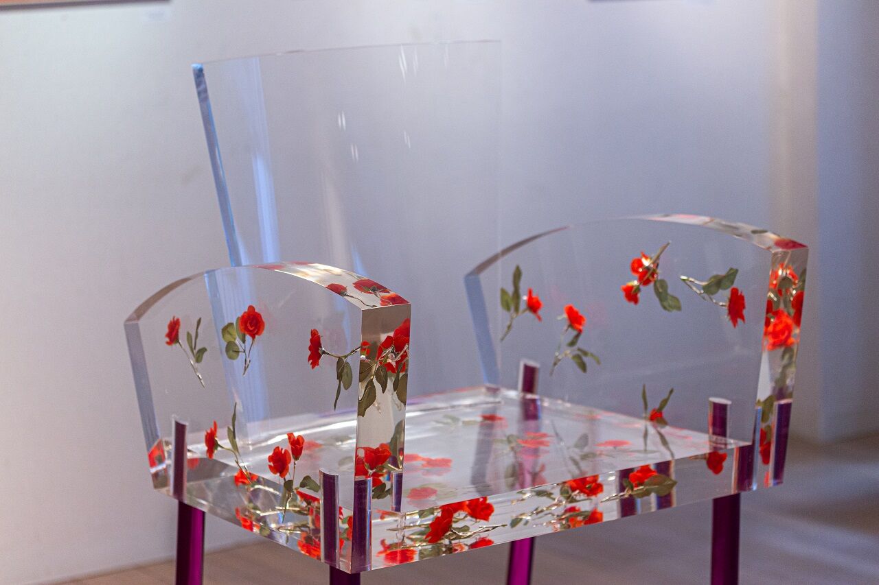 透明アクリルを嵌入する、なんともいえない美しい色合いのアルミパイプが、露出した構造体のように丸ごと見える。それ以上に目を惹くのは、座と左右肘掛け面のなかに閉じこめられながら咲く、いくつもの薔薇の切り花である。「ミス・ブランチ」に接するとき、いちばんはじめに目を奪う、そしてさいごまでその印象で椅子がつくりあげられるほどの、赤いかたちである。