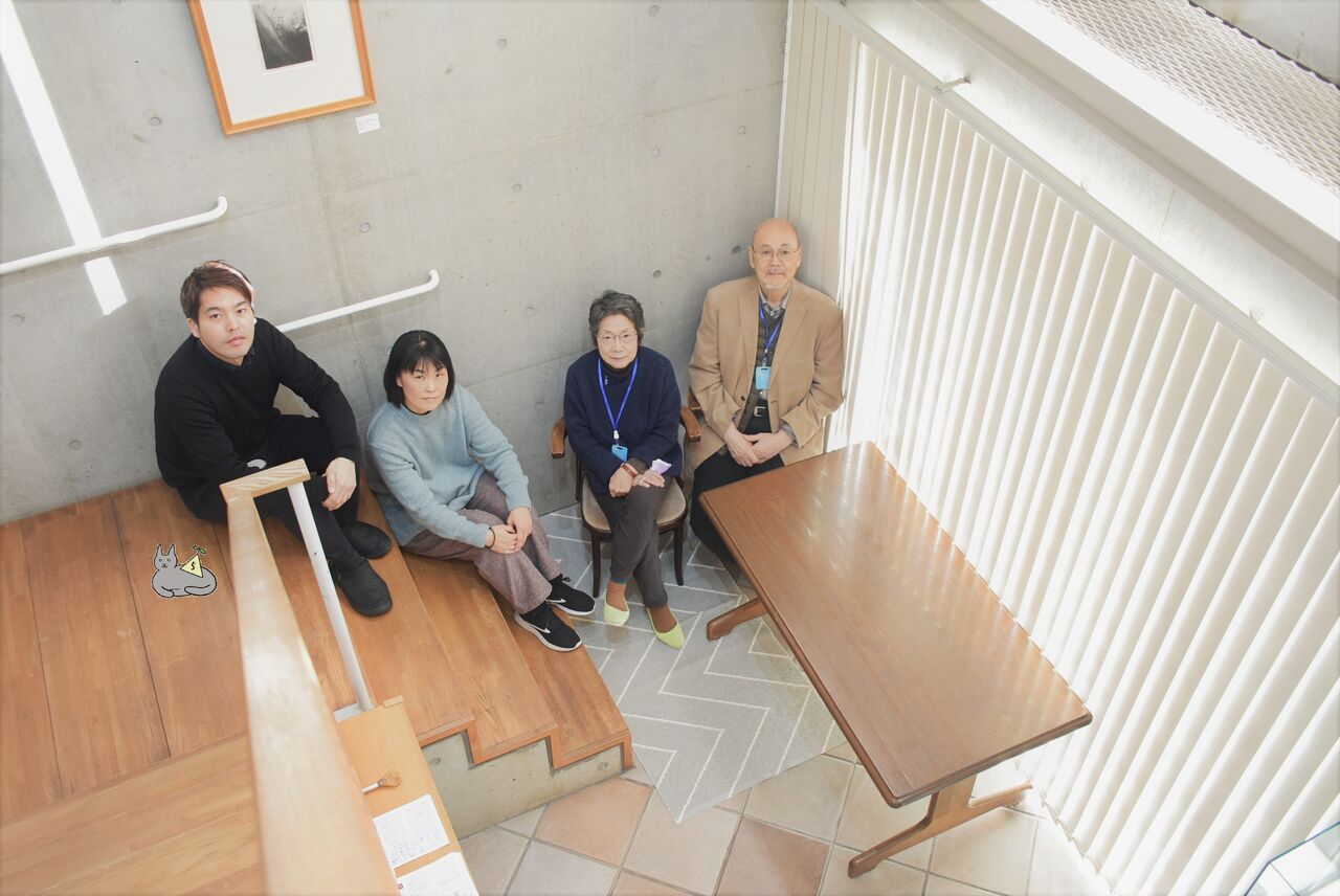 昨年末閉めたMORIOKA第一画廊から受け継いだテーブルと椅子を囲んで、左から松下、加畑、社長、画廊亭主。