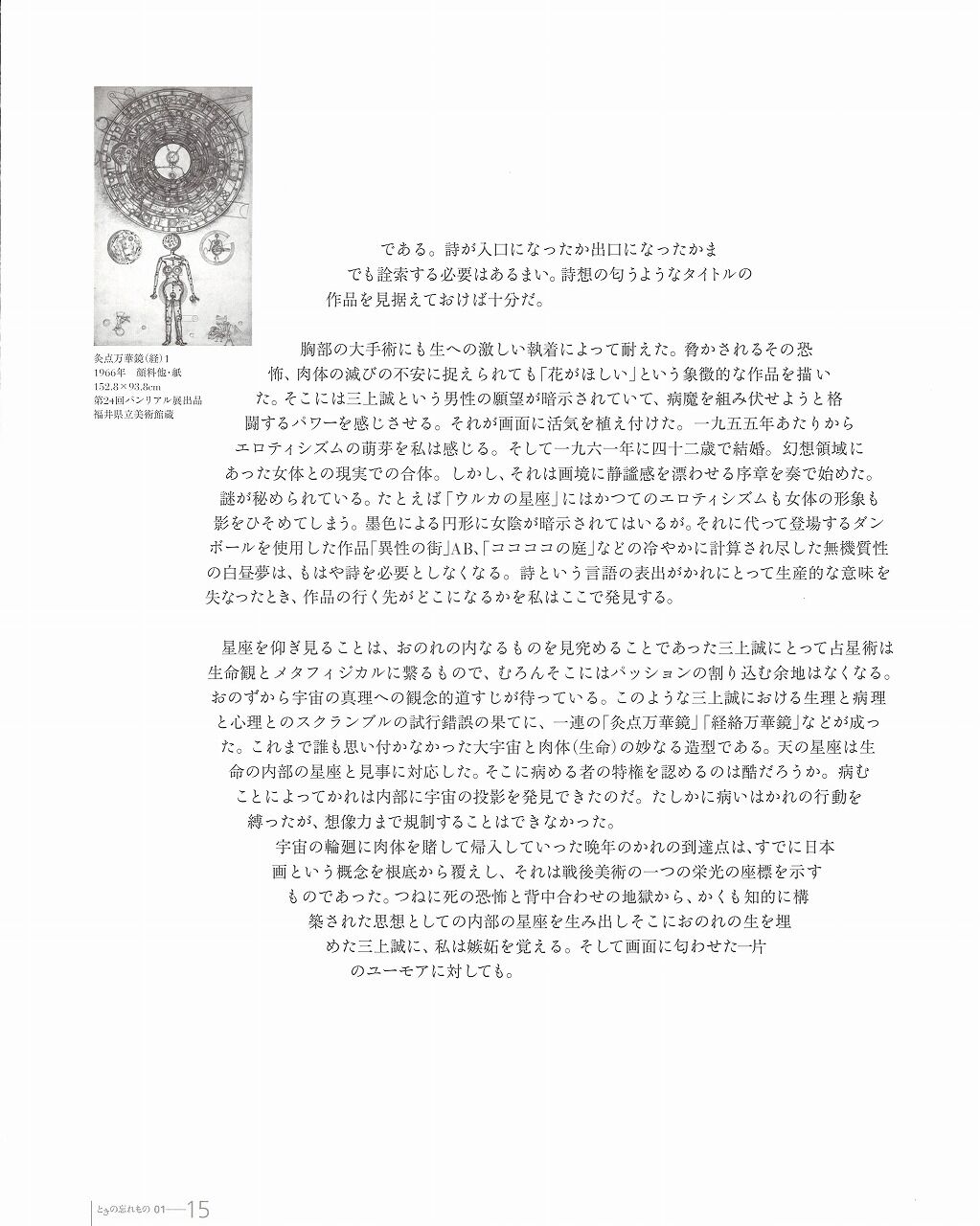 宇宙の輪廻に肉体を賭して帰入していった晩年のかれの到達点は、すでに日本画という概念を根底から覆えし、それは戦後美術の一つの栄光の座標を示すものであった。つねに死の恐怖と背中合わせの地獄から、かくも知的に構築された思想としての内部の星座を生み出しそこにおのれの生を埋めた三上誠に、私は嫉妬を覚える。そして画面に匂わせた一片のユーモアに対しても。