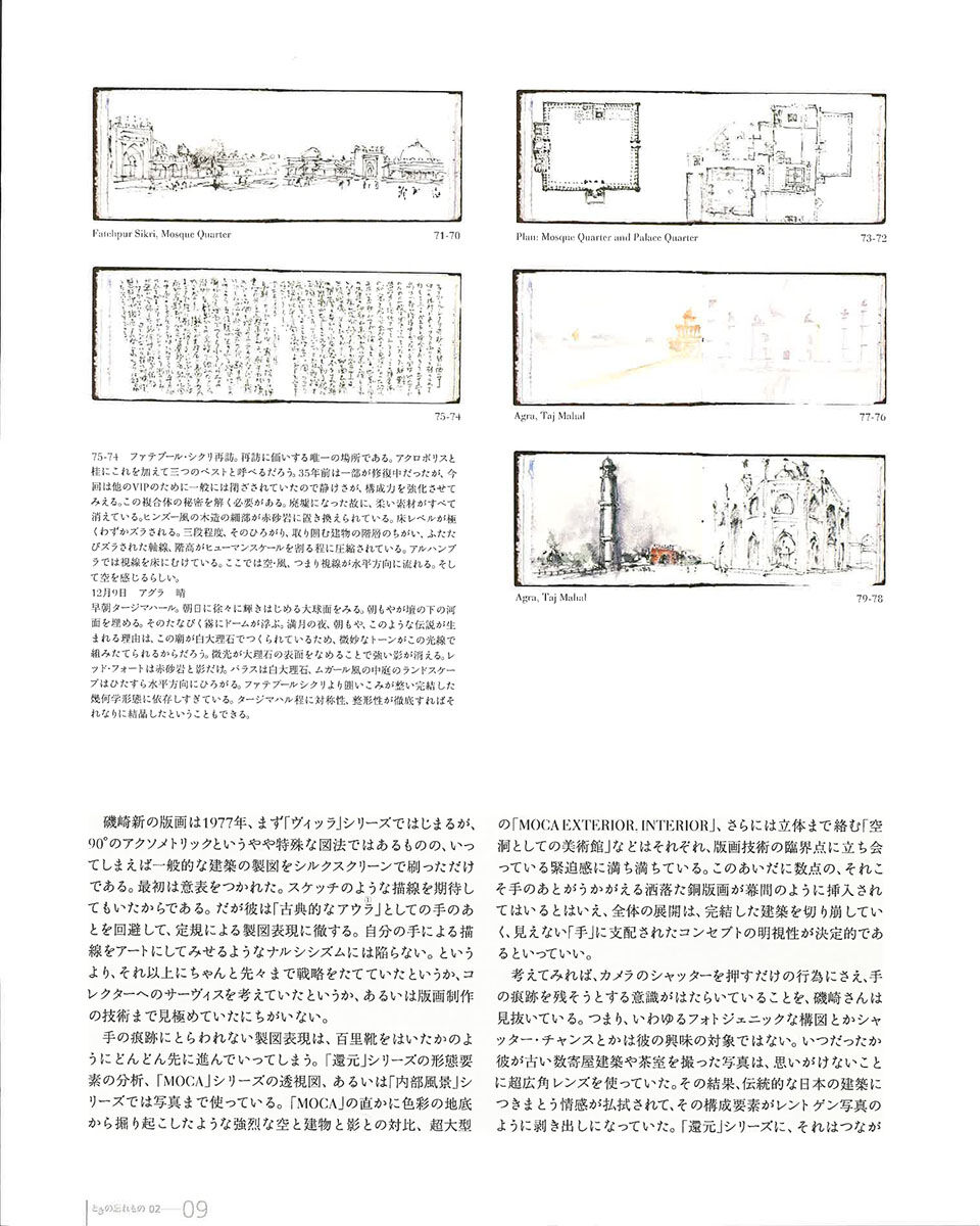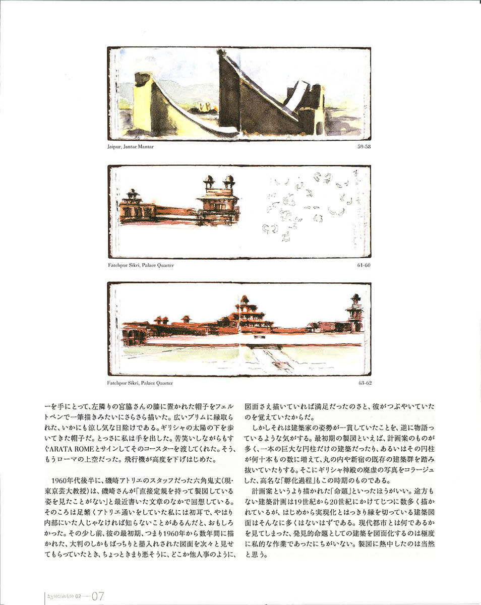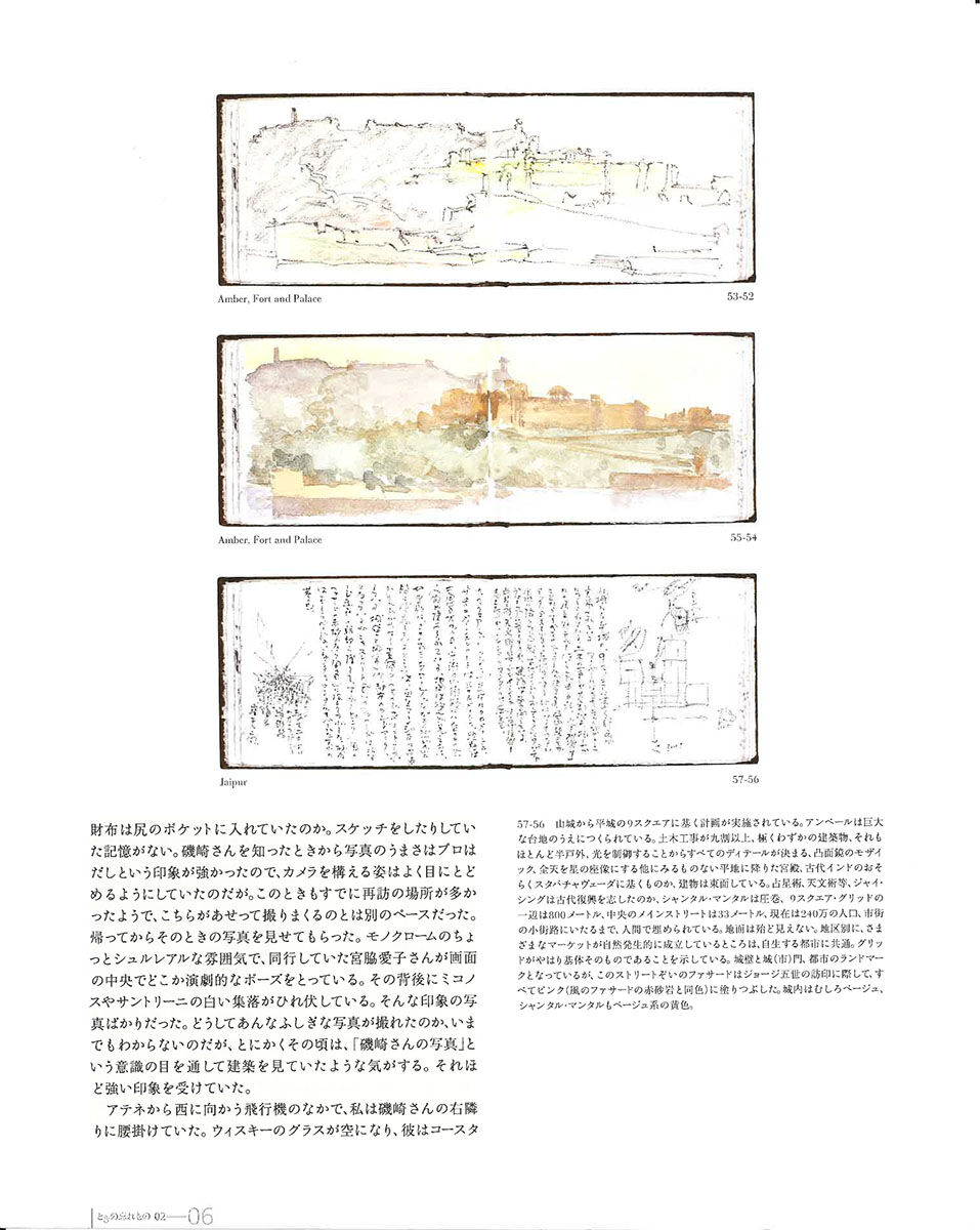 しかし最近の磯崎さんはそのカメラも持たない。今度インドを旅したときもそうだし、建築の構想も同じ小さなスケッチブックに筆ペンと絵具で、スケッチ風の描写に戻っている。いや戻っているというのは不確かで、うんと先に行ってしまったという実感のほうが強い。