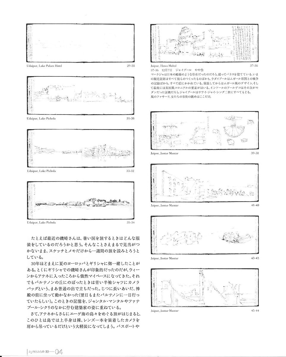 たとえば最近の磯崎さんは、暑い国を旅するときはどんな服装をしているのだろうかと思う。そんなことさえまるで見当がつかないまま、スケッチとメモだけから一週間の旅を読みとろうとしている。