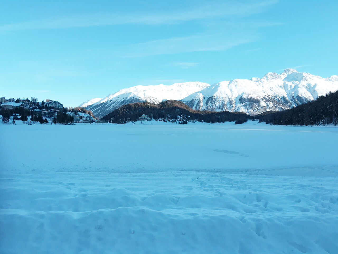 気を取り直して歩きながら湖を眺めると、雪が平原に積もったように見えます。湖が凍ってそこに雪が積もっているのです。毎年2月には、ここで馬の氷上レースが行われています。