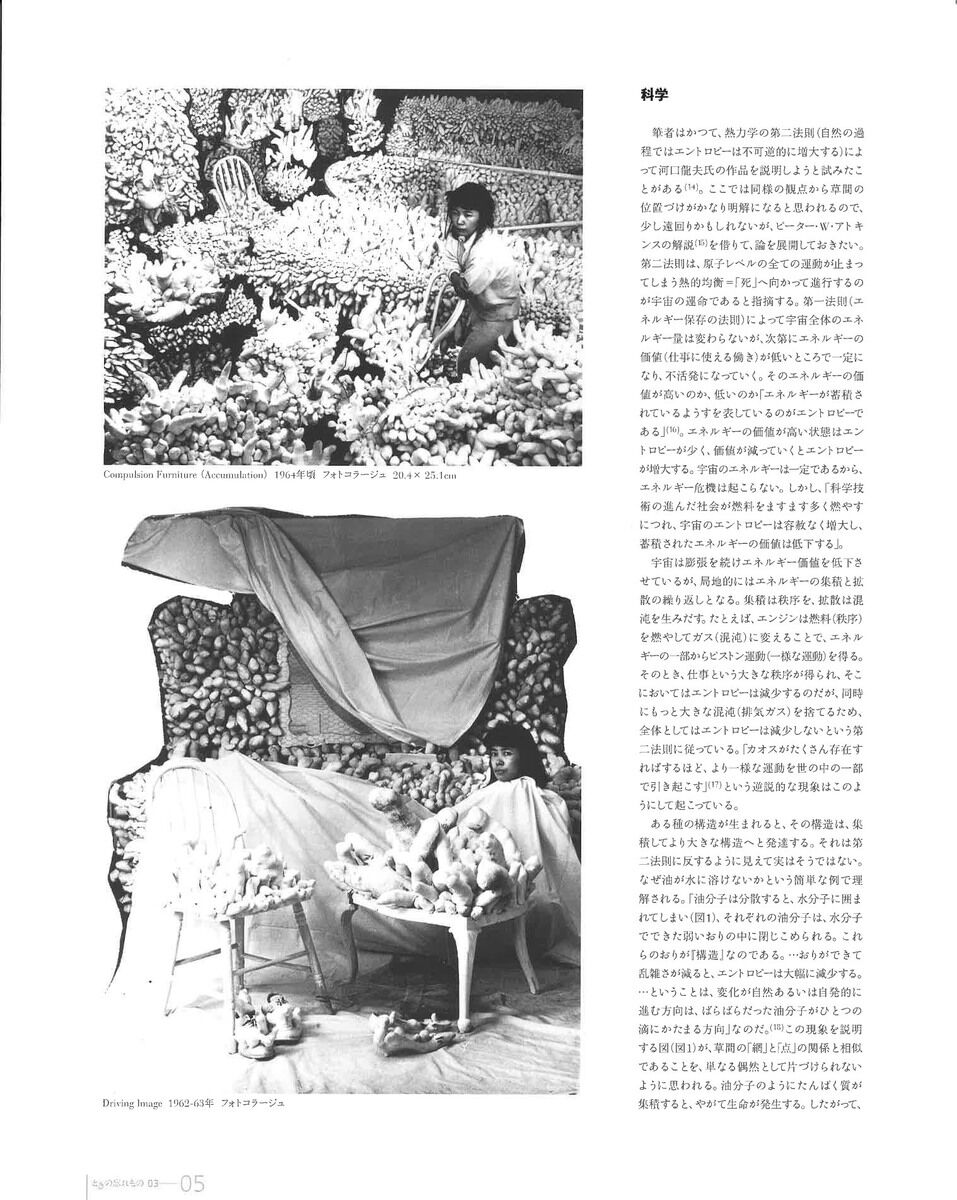 筆者はかつて、熱力学の第二法則(自然の過程ではエントロピーは不可逆的に増大する)によって河口龍夫氏の作品を説明しようと試みたことがある(14)。ここでは同様の観点から草間の位置づけがかなり明解になると思われるので、少し遠回りかもしれないが、ピーター・W・アトキンスの解説(15)を借りて、論を展開しておきたい。 第二法則は、原子レベルの全ての運動が止まってしまう熱的均衡=「死」へ向かって進行するのが宇宙の運命であると指摘する。第一法則(エネルギー保存の法則)によって宇宙全体のエネルギー量は変わらないが、次第にエネルギーの価値(仕事に使える働き)が低いところで一定になり、不活発になっていく。そのエネルギーの価値が高いのか、低いのか「エネルギーが蓄積さ れているようすを表しているのがエントロピーである」(16)。エネルギーの価値が高い状態はエントロピーが少く、価値が減っていくとエントロピーが増大する。宇宙のエネルギーは一定であるから、エネルギー危機は起こらない。しかし、「科学技術の進んだ社会が燃料をますます多く燃やすにつれ、宇宙のエントロピーは容赦なく増大し、 蓄積されたエネルギーの価値は低下する」。