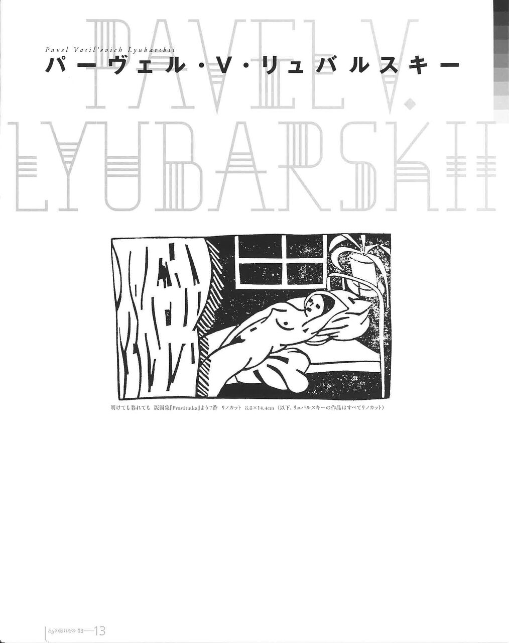 傑作にまつわるさまざまなエピソードはしばしばその数奇な運命を物語るが、通例あまり注目されない版画の版も例外ではない。もともと版画は複数制作を前提としているが、無際限に刷ることが可能ではないので、作質を確保するために、限定数を設けるなどして、原版が作家自身や刊行者により破棄されるのが通例である。だが、もとよりすべての原版がきちんとした管理のもとにあるわけではないので、例外がないとはいえない。作者の手を離れ、すでに作者が死去した後に、こつぜんと原版が姿を現すこともある。本誌に収録されたパーヴェル・ワシーリエヴィチ・リュバルスキー(Pavel Vasil'evich Lyubarskii, 1891年ハバロフスク生―1968年モスクワ没) の一連のリノカット原版もその一例である。