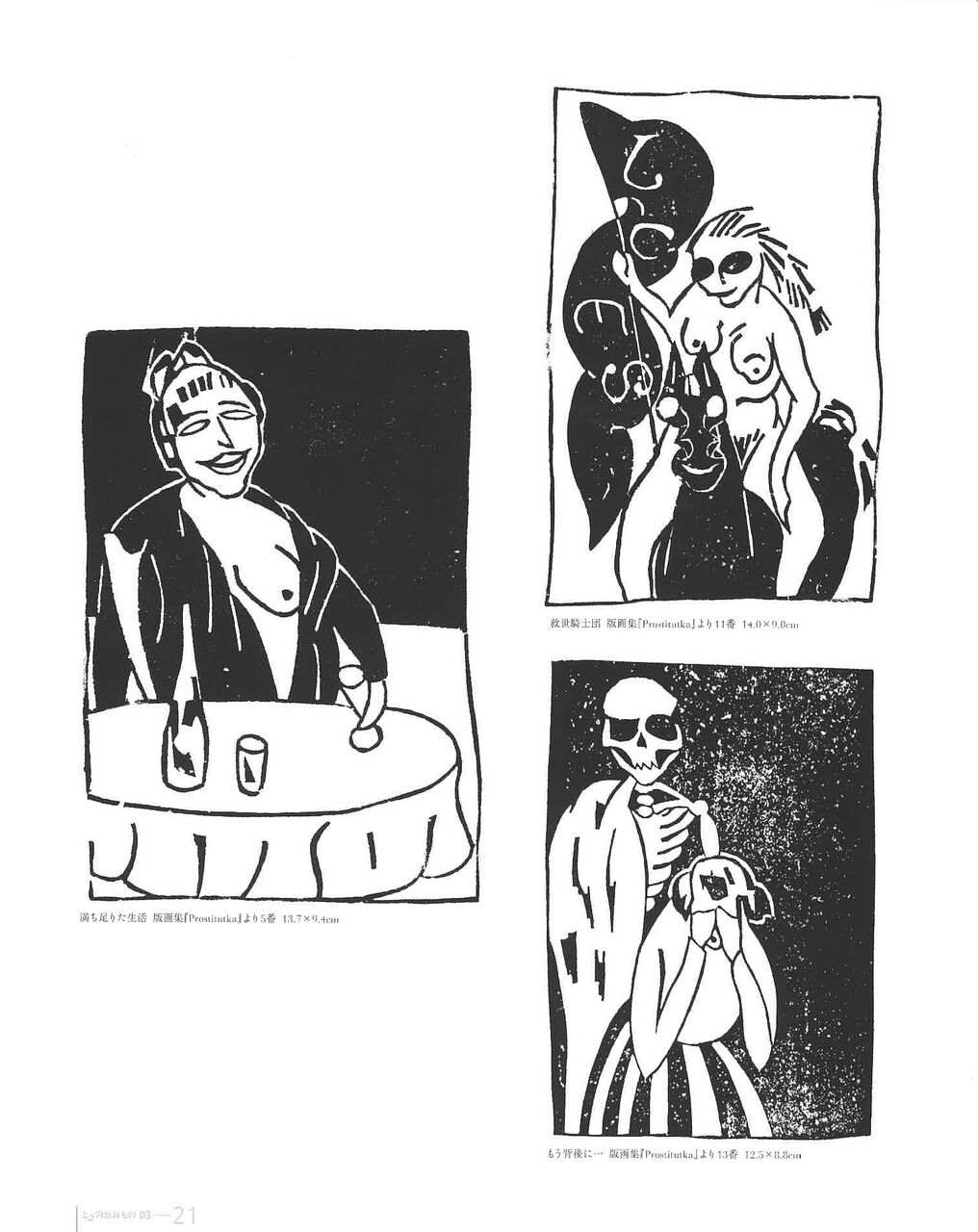 ここでリュバルスキーのリノカットの内容について一瞥しておこう。全部で8点の原版が残されているが、いずれも性と絡んだ「グロテスク」の要素に満ちている。その点で、ひとつの連作のようにみえないだろうか。実際、これらはいずれも娼婦を主題とした版画集の一部だったのである。それは「緑の猫」発行の版画集で『娼婦 Prostitutka』と題されている。マヤコフスキー文学博物館所蔵本には、1971年のM・アヴェトフによる記載があり、極東の美術家たちの作品を収集したイワノフ(リュバルスキーの妹の夫=義理の弟)の寄贈資料に含まれていたとある。そして版画集には表紙を除くと全部で13点が収められ、さらに、おそらくウラジオストクの沿海地方美術館蔵のイワノフ資料から推してイワノフ自身が筆記したらしい各作品ごとの題名が添付されている。最初から掲載順に仮番号を打つと、日本に原版があるのは、3、5、6、7、8、10、11、13番である。