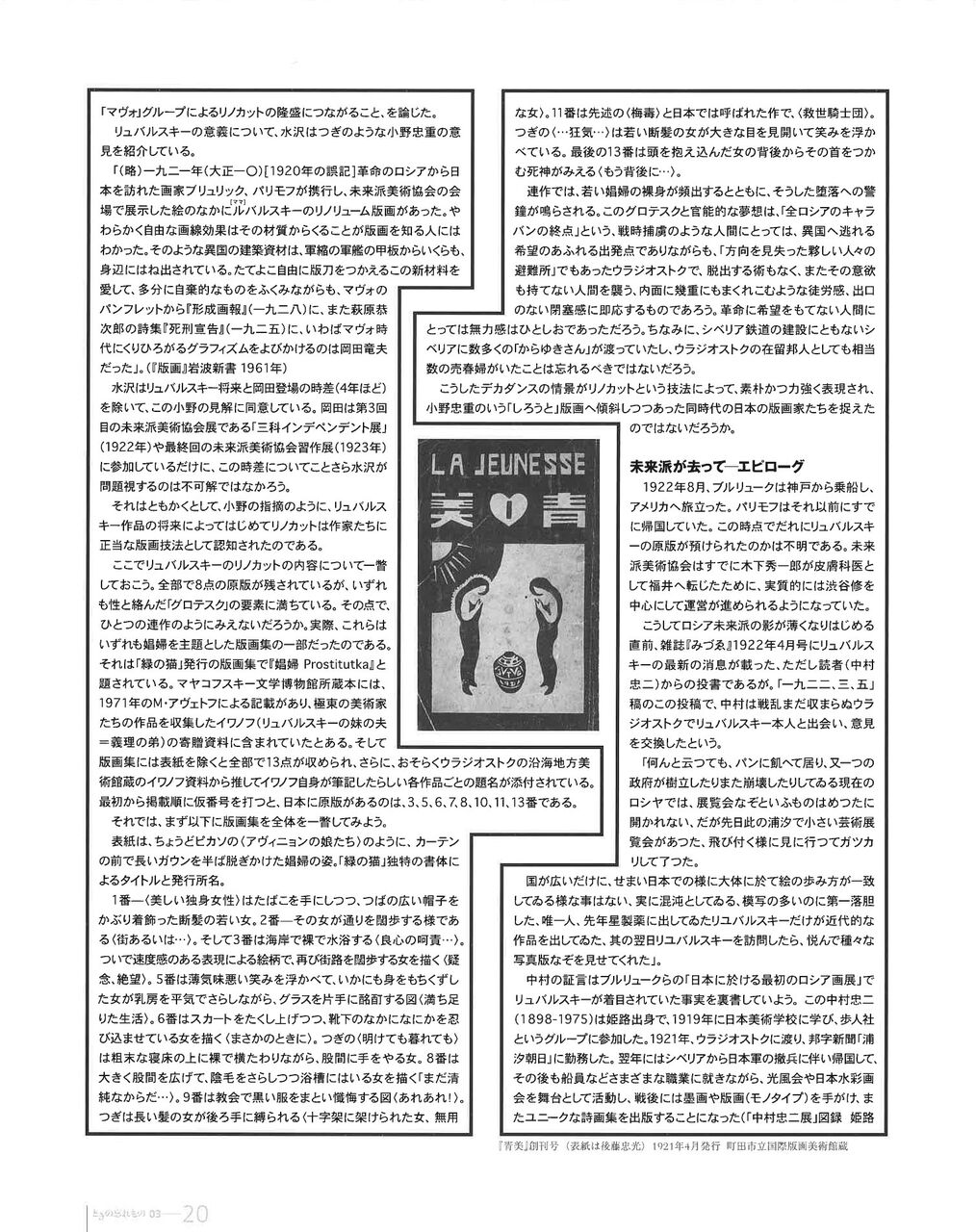 だが、このことはリュバルスキーが関心を喚起しなかったことと同じではない。版画に関心を抱く作家たちには訴えるところがあったようだ。現に翌1921年4月に発行された詩と版画の同人雑誌『青美』創刊号には、〈無題〉として赤地に刷られたリノカットが挿入された。最近になって再発見されたこの雑誌は未来派美術協会展第1回展に参加し、やがて木下秀一郎らと意見を異にして協会から脱退した後藤忠光が中心となって刊行したもので、大正期新興美術運動の一翼を担った(『版ニュース』No.3 1994年「輝開」発行、および滝沢恭司「大正期モダニズムの一枝―未来派美術協会々員後藤忠光と『青美』について」『町田市立国際版画美術館紀要』3号 1999年)。