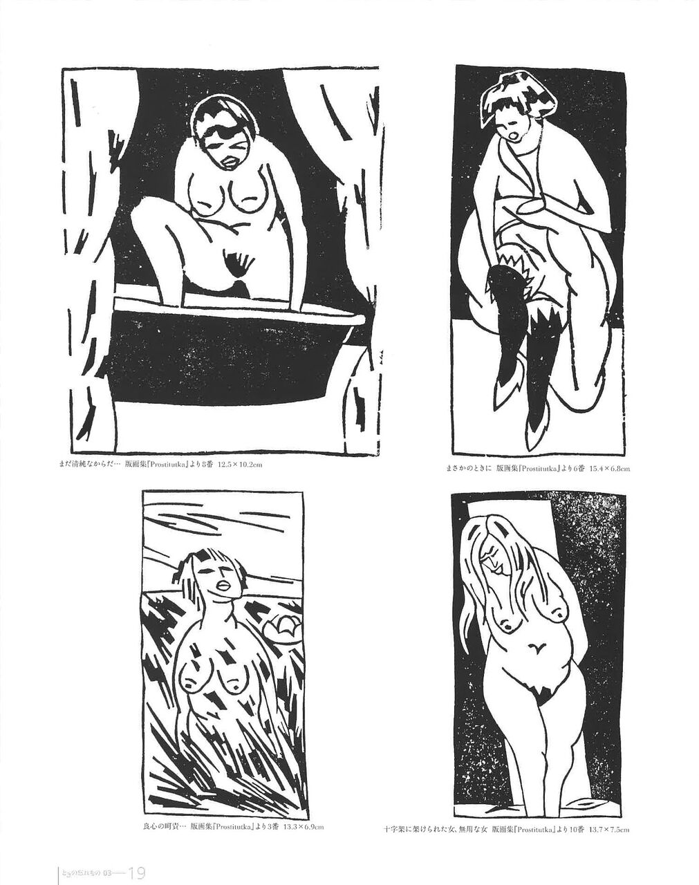 1番―〈美しい独身女性〉はたばこを手にしつつ、つばの広い帽子をかぶり着飾った断髪の若い女。2番―その女が通りを闊歩する様である〈街あるいは…〉。そして3番は海岸で裸で水浴する〈良心の呵責…〉。ついで速度感のある表現による絵柄で、再び街路を闊歩する女を描く〈疑念、絶望〉。5番は薄気味悪い笑みを浮かべて、いかにも身をもちくずした女が乳房を平気でさらしながら、グラスを片手に酩酊する図〈満ち足りた生活〉。6番はスカートをたくし上げつつ、靴下のなかになにかを忍び込ませている女を描く〈まさかのときに〉。つぎの〈明けても暮れても〉は粗末な寝床の上に裸で横たわりながら、股間に手をやる女。8番は大きく股間を広げて、陰毛をさらしつつ浴槽にはいる女を描く〈まだ清純なからだ…〉。9番は教会で黒い服をまとい懺悔する図〈あれあれ!〉。つぎは長い髪の女が後ろ手に縛られる〈十字架に架けられた女、無用な女〉。11番は先述の〈梅毒〉と日本では呼ばれた作で、〈救世騎士団〉。つぎの〈…狂気…〉は若い断髪の女が大きな目を見開いて笑みを浮かべている。最後の13番は頭を抱え込んだ女の背後からその首をつかむ死神がみえる〈もう背後に…〉。