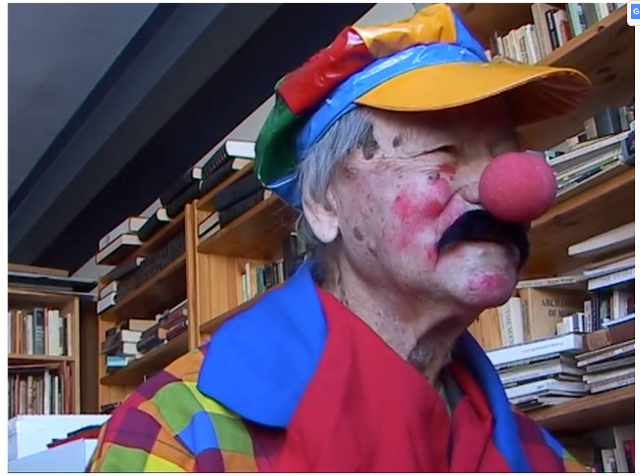 『ベルリン芸術週間』のSkypeインタビューに、なぜか道化師の格好で登場するメカス。見た目はおどけているものの、その受け答えは非常にストイックで、たとえば「あなたにとって時間は何を意味しますか?」という観客からの質問に対しては「時間は時間で、それ以外の何でもない。誰が気にするものか!馬鹿げた質問だ」と回答。筆者もメカスさんのご自宅に伺った際、映画の中で時間が過ぎ去っていく感覚について尋ねたら「Time is just there.(時間はそこにあるだけ)」ときっぱり返答されたのを思い出しました……。