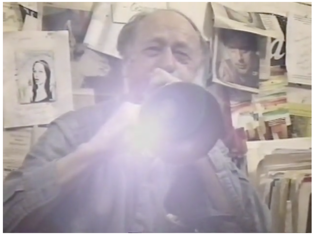 アンソロジー・フィルム・アーカイヴスの中で長い笛を吹いていたかと思えば、今度はラッパの即興演奏を始めるメカス。おそるべき肺活量と、その自由な空間に思わず頰がゆるむ。